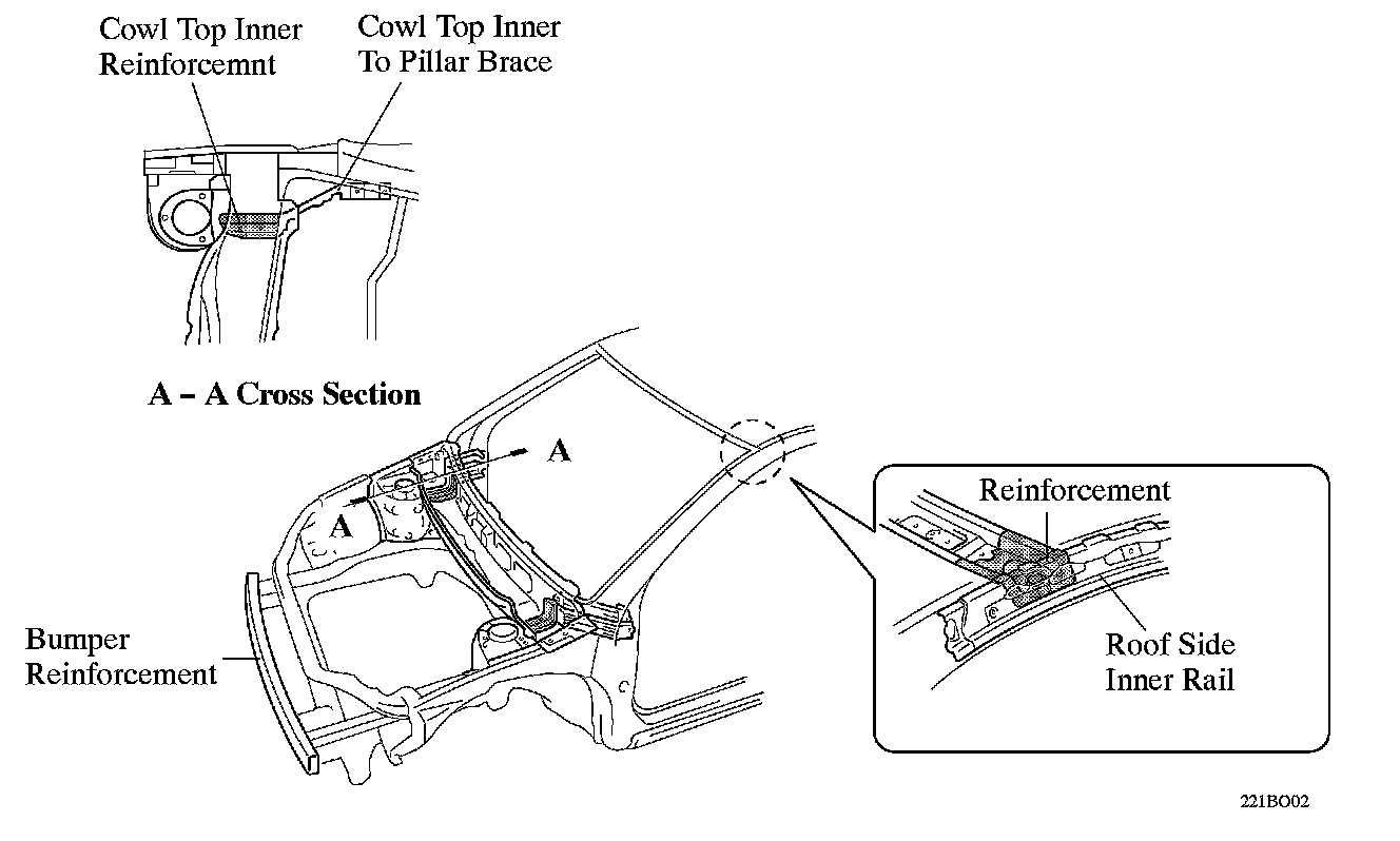 ^ A roof side inner rail has been placed in the front pillar, and reinforcement has been provided in the area where the roof side inner rail and the front windshield header are joined, to ensure rigidity.