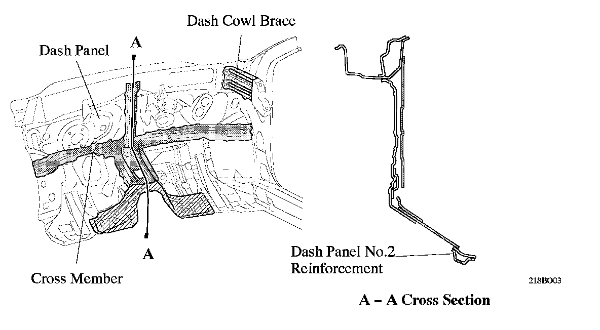 ^ A cross member and a dash cowl brace have been placed in the dash panel to reduce the vibration of the dash panel. Furthermore, a dash panel No.2 reinforcement has been placed at the bottom of the floor tunnel to reduce the vibration of the front floor.