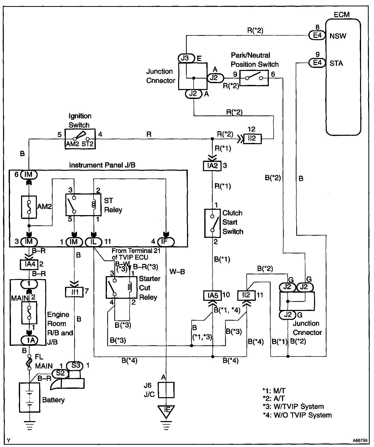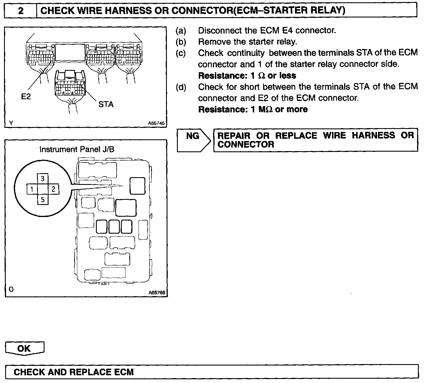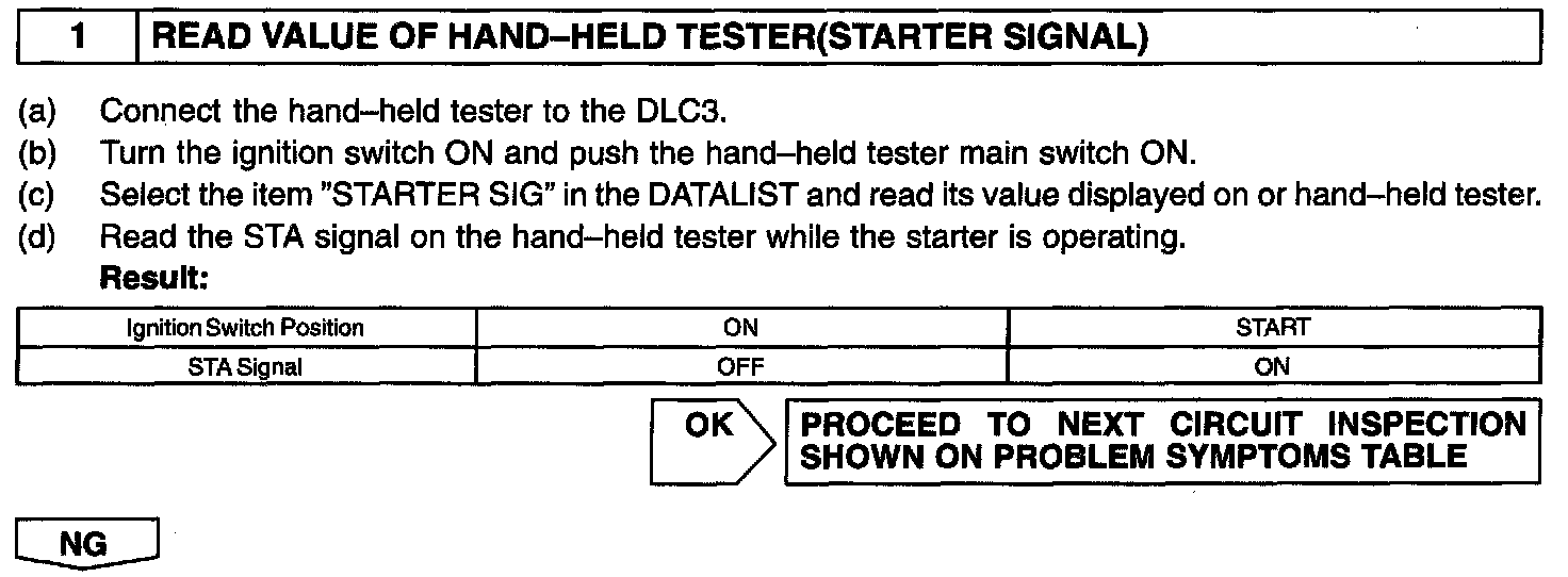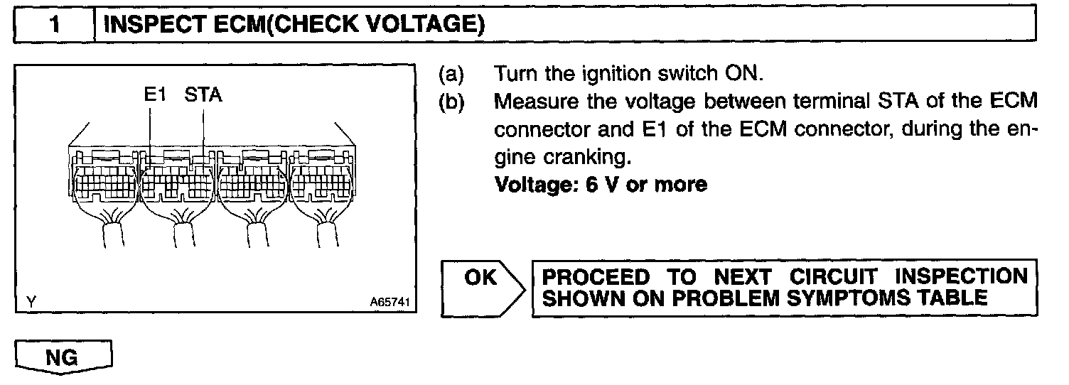 CIRCUIT DESCRIPTIONWhen the engine is cranked, the intake air flow is slow, so fuel vaporization is poor. A rich mixture is therefore necessary in order to achieve good startability. While the engine is being cranked, the battery voltage is applied to terminal STA of the ECM. The starter signal is mainly used to increase the fuel injection volume for the starting injection control and after-start injection control.