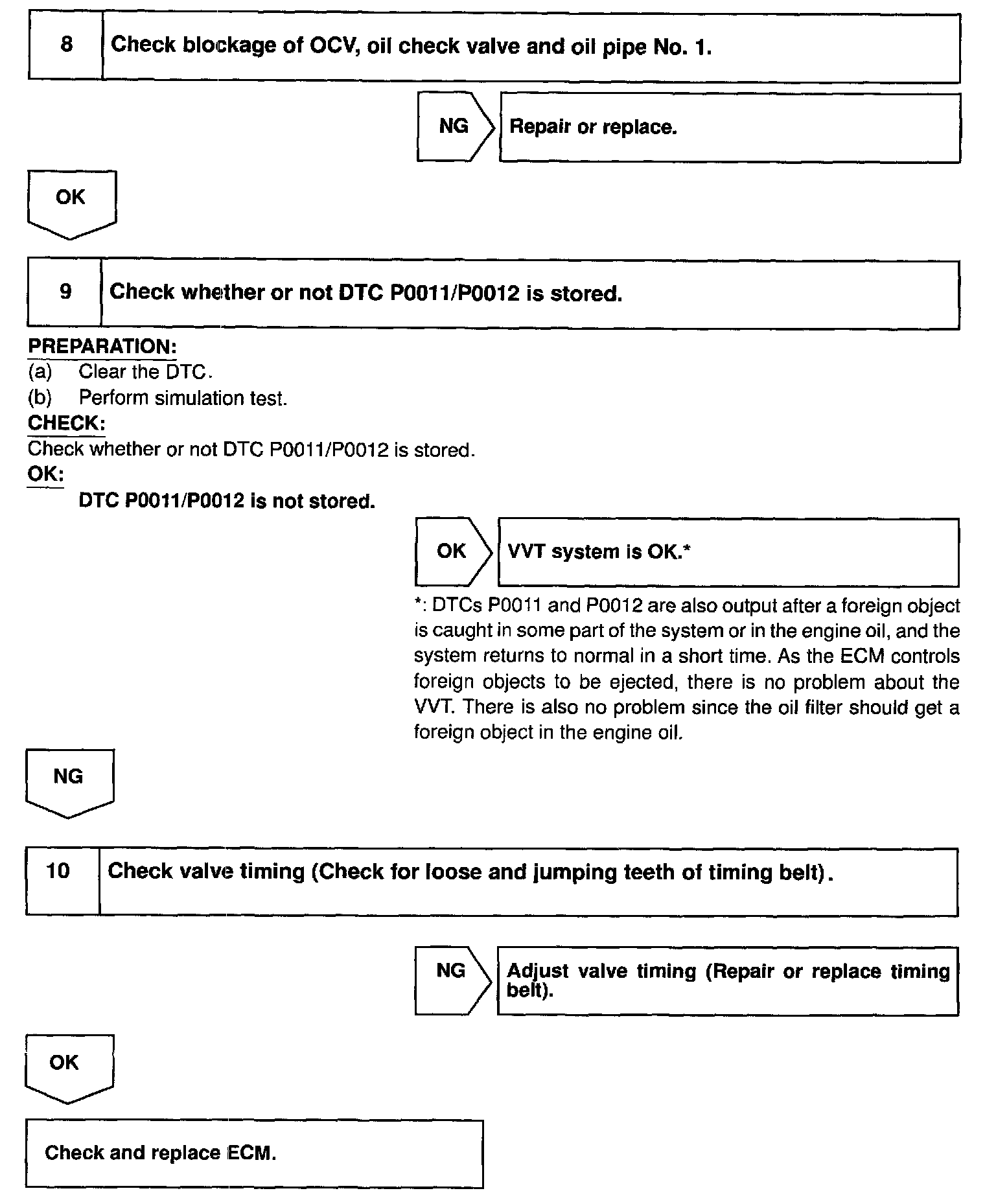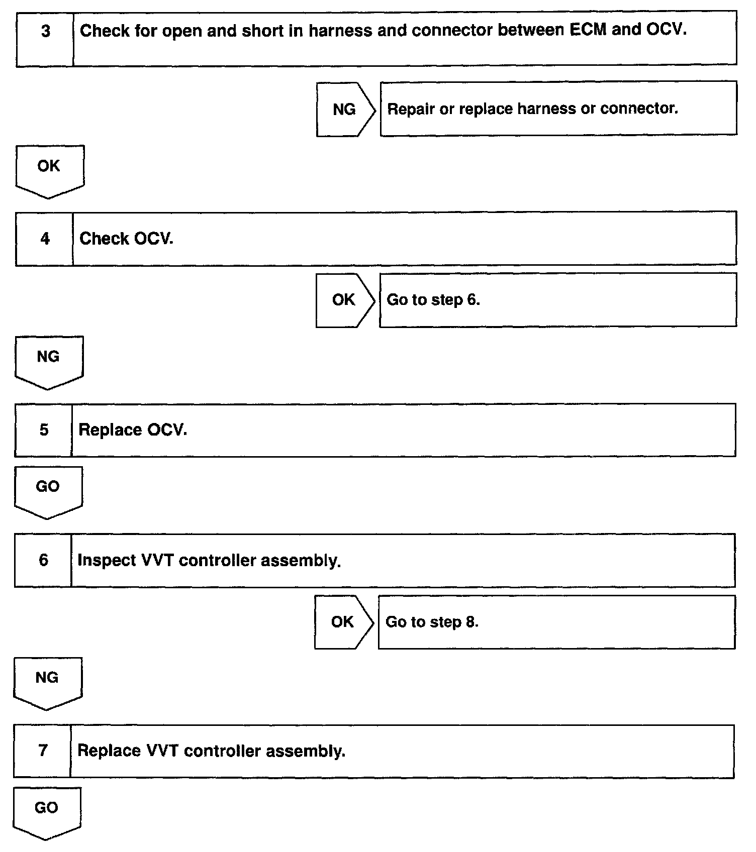 The VVT system controls the intake valve timing properly in response to the driving condition. The ECM controls the Oil Control Valve (OCV) to make the intake valve timing properly, and the oil pressure controlled with the OCV is supplied to the VVT controller, and then the VVT controller changes relative position between the camshaft and the crankshaft.