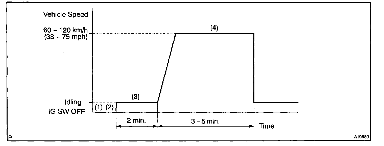 4. Drive the vehicle at 60 - 120 km/h (38 - 75 mph) and engine speed at 1,600 - 3,200 rpm for 3 - 5 minutes