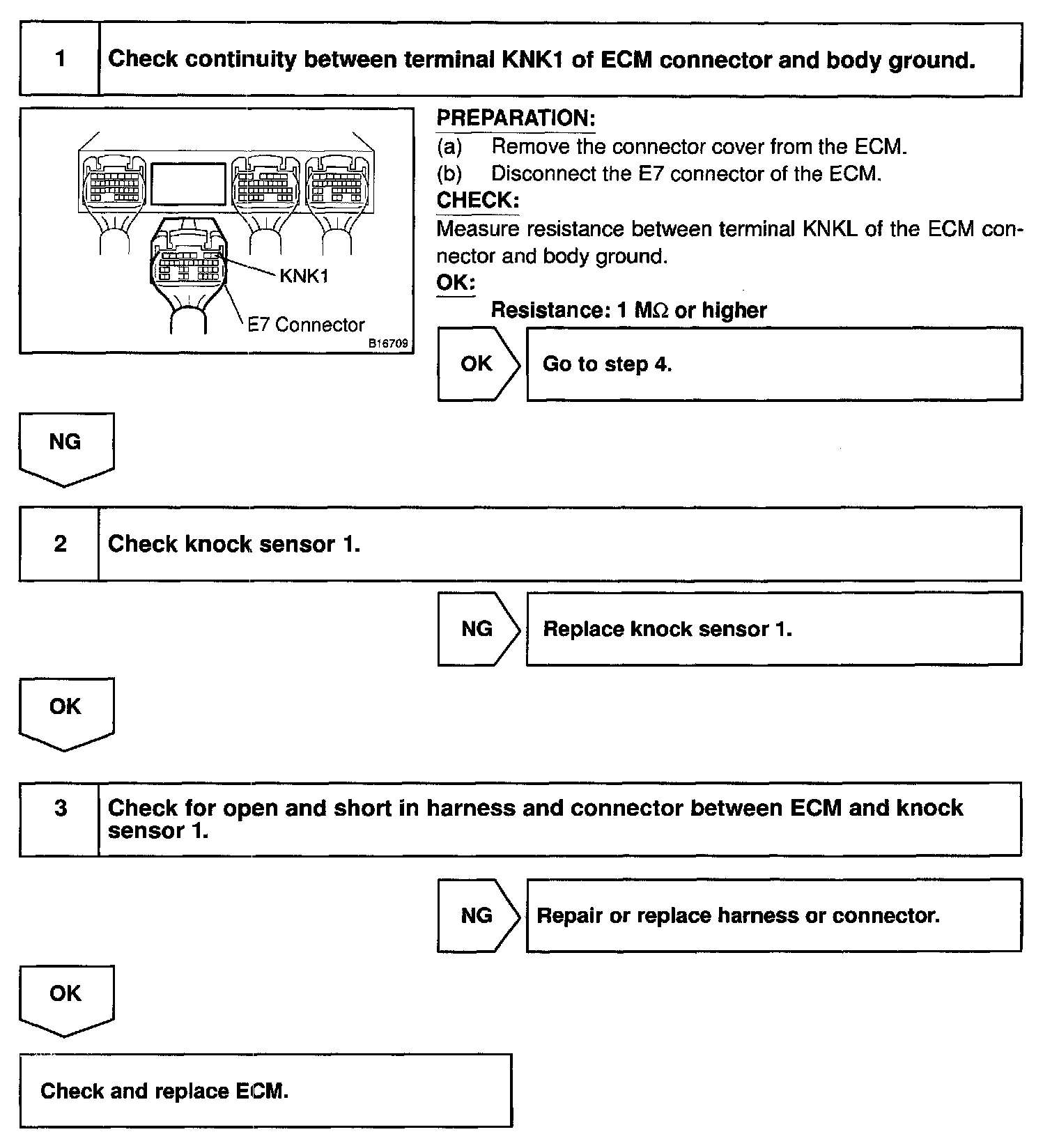 The each knock sensor is fitted to the cylinder block to detect engine knocking. This sensor contains a piezo-electric element which generates a voltage when it becomes deformed. The piezo-electric element sends a signal to the ECM, when the cylinder block vibrates due to knocking. If engine knocking occurs, ignition timing is retarded to suppress it.