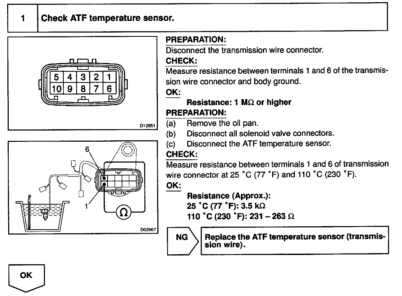 The ATF temperature sensor converts fluid temperature into a resistance value which is input into the ECM.