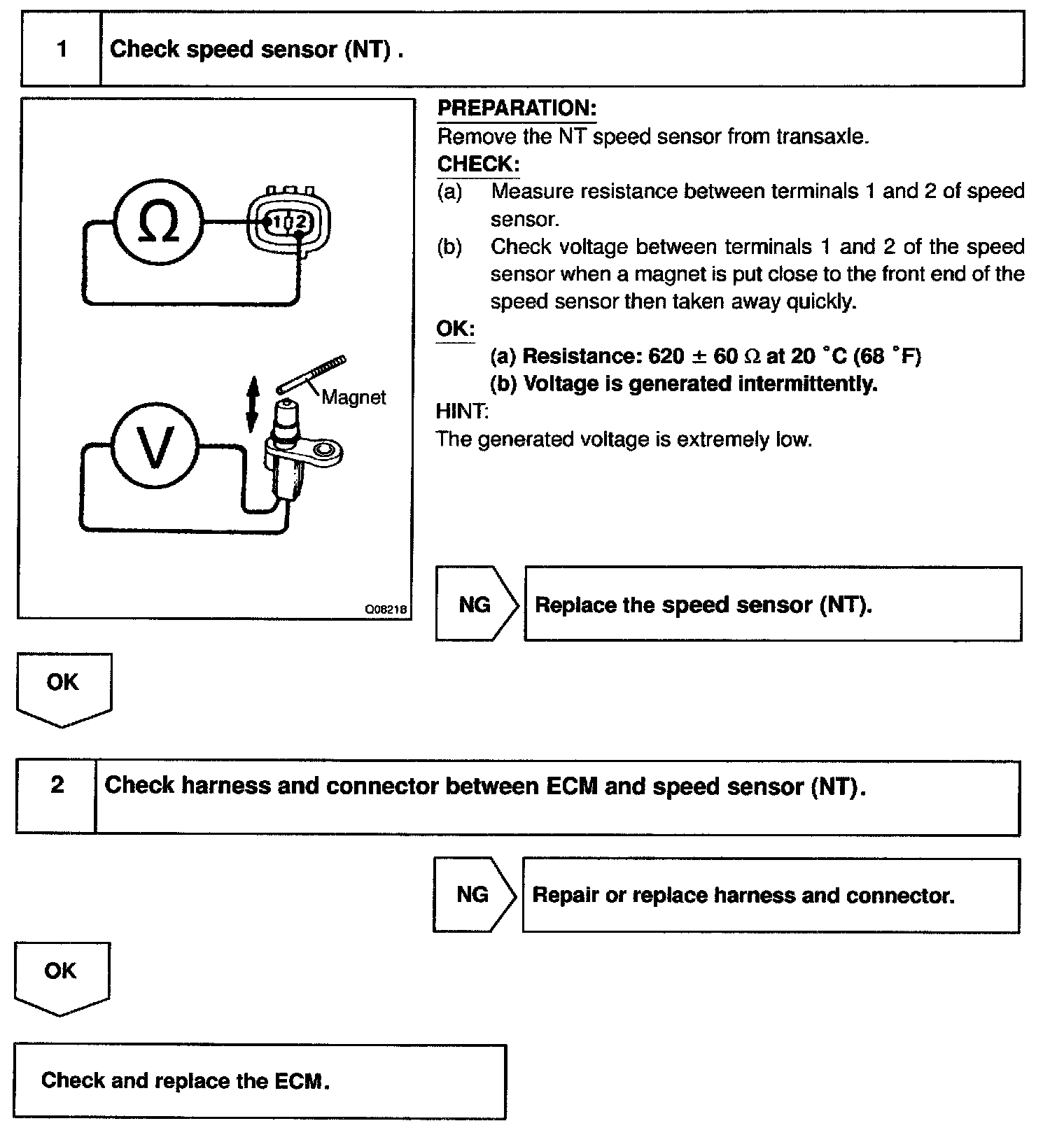 This sensor detects the rotation speed of the input turbine. By comparing the input turbine speed signal (NT) with the counter gear speed sensor signal (NC), the ECM detects the shift timing of the gears and appropriately controls the engine torque and hydraulic pressure in response to various conditions, thus performing smooth gear shifting.