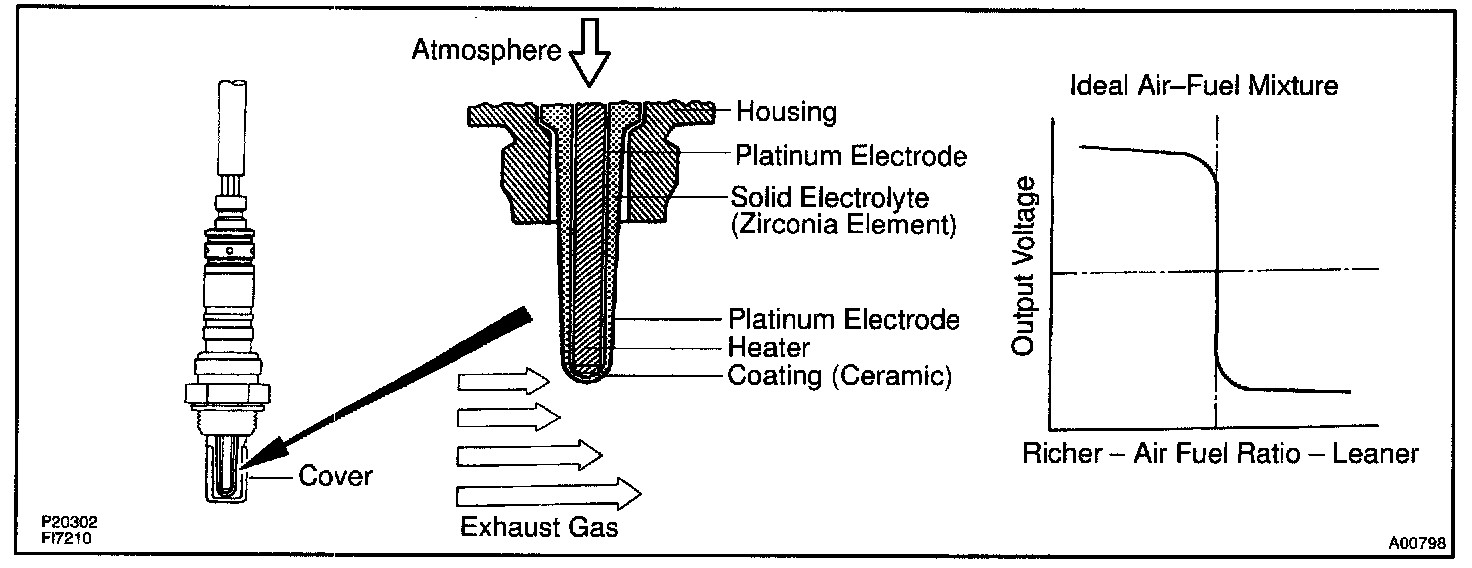 The oxygen sensor has the characteristic which its output voltage changes suddenly in the vicinity of the stoichiometric air-fuel ratio. This characteristic is used to detect the oxygen concentration in the exhaust gas and provide the ECM with feedback to control the air-fuel ratio.