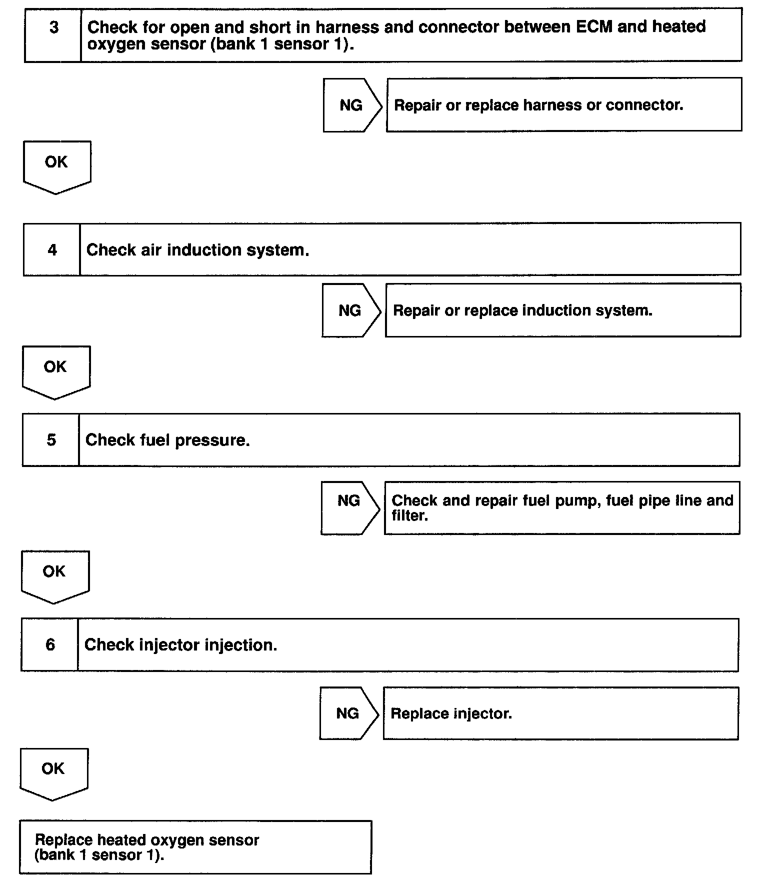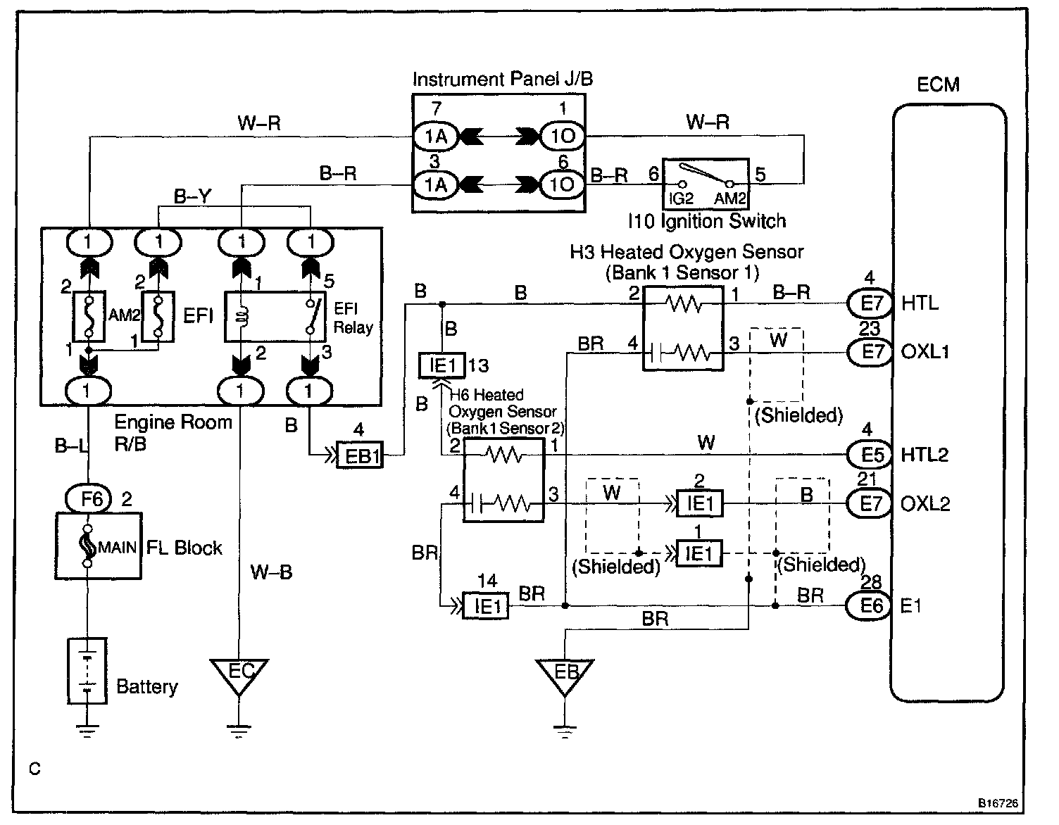When the air-fuel ratio is RICHER than the stoichiometric air-fuel ratio, the oxygen concentration in the exhaust gas is reduced and the oxygen sensor informs the ECM of the RICH condition (large electromotive force: > 0.45 V). The ECM judges by the electromotive force from the oxygen sensor whether the air-fuel ratio is RICH or LEAN and controls the injection time accordingly. However, if malfunction of the oxygen sensor causes output of abnormal electromotive force, the ECM is unable to perform accurate air-fuel ratio control. The heated oxygen sensors include a heater which heats the zirconia element. The heater is controlled by the ECM. When the intake air volume is low (the temperature of the exhaust gas is low) current flows to the heater to heat the sensor for accurate oxygen concentration detection.