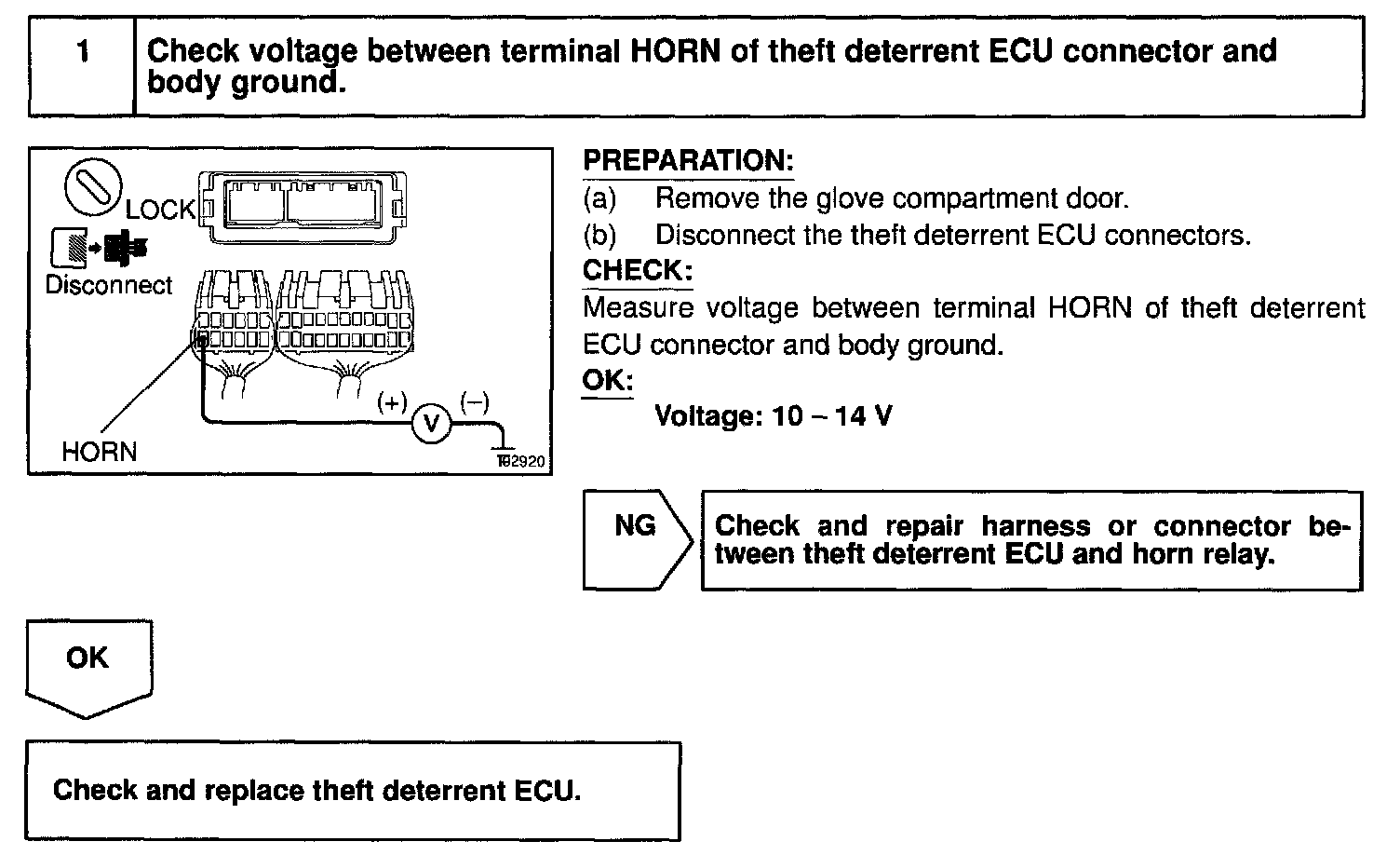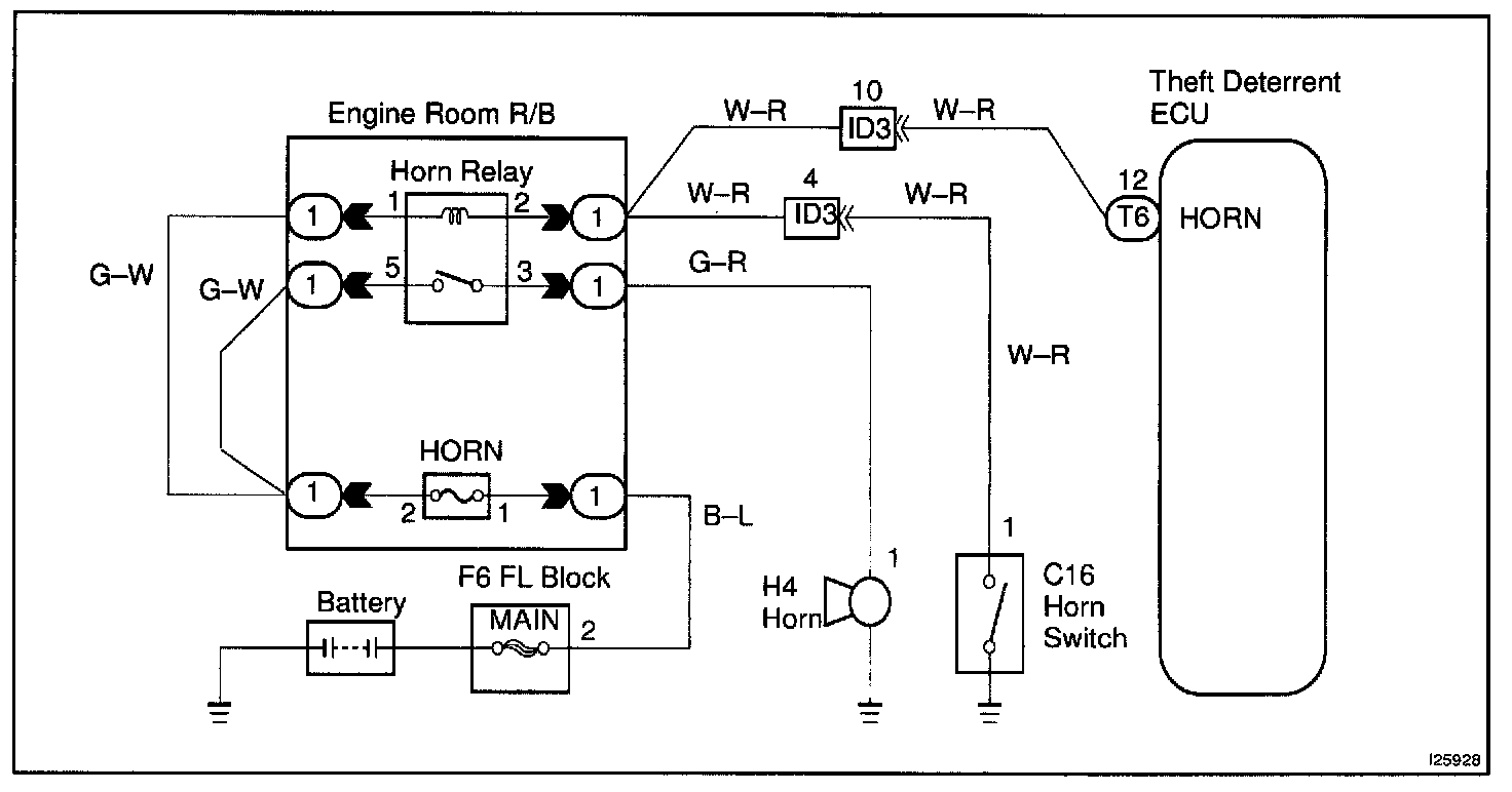 CIRCUIT DESCRIPTIONWhen the theft deterrent system is activated, it causes the Tr in the ECU to switch ON and OFF in approximately 0.4 sec. cycles. This switches the horn relay ON and OFF, thus the horns blow (See the wiring diagram).