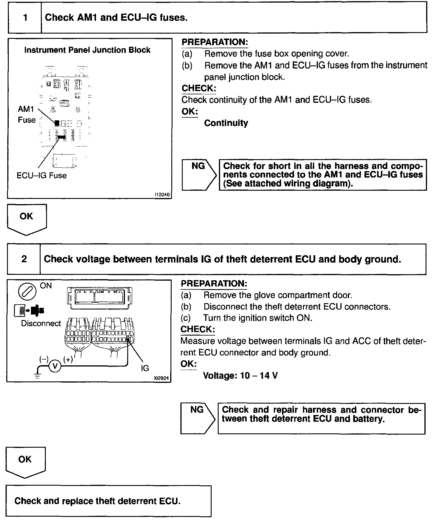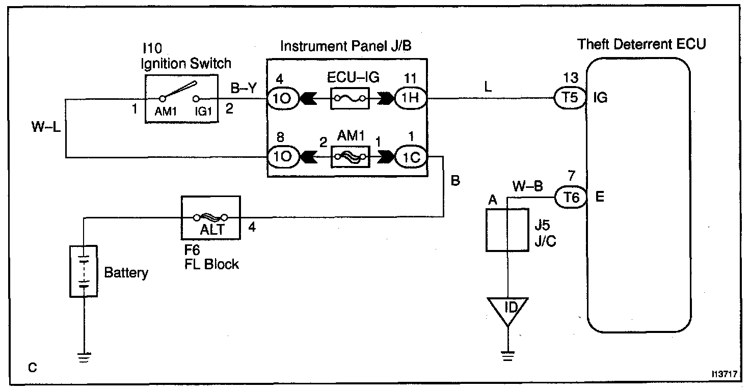 CIRCUIT DESCRIPTIONWhen the ignition switch is turned to the ACC position, battery positive voltage is applied to the terminal ACC of the ECU. Also, if the ignition switch is turned to the ON position, battery positive voltage is applied to the terminals ACC and IG of the ECU. When the battery positive voltage is applied to the terminal ACC of the ECU while the theft deterrent system is activated, the warning stops. Furthermore, power supplied from the terminals ACC and IG of the ECU is used as power for the door courtesy switch, and position switch, etc.