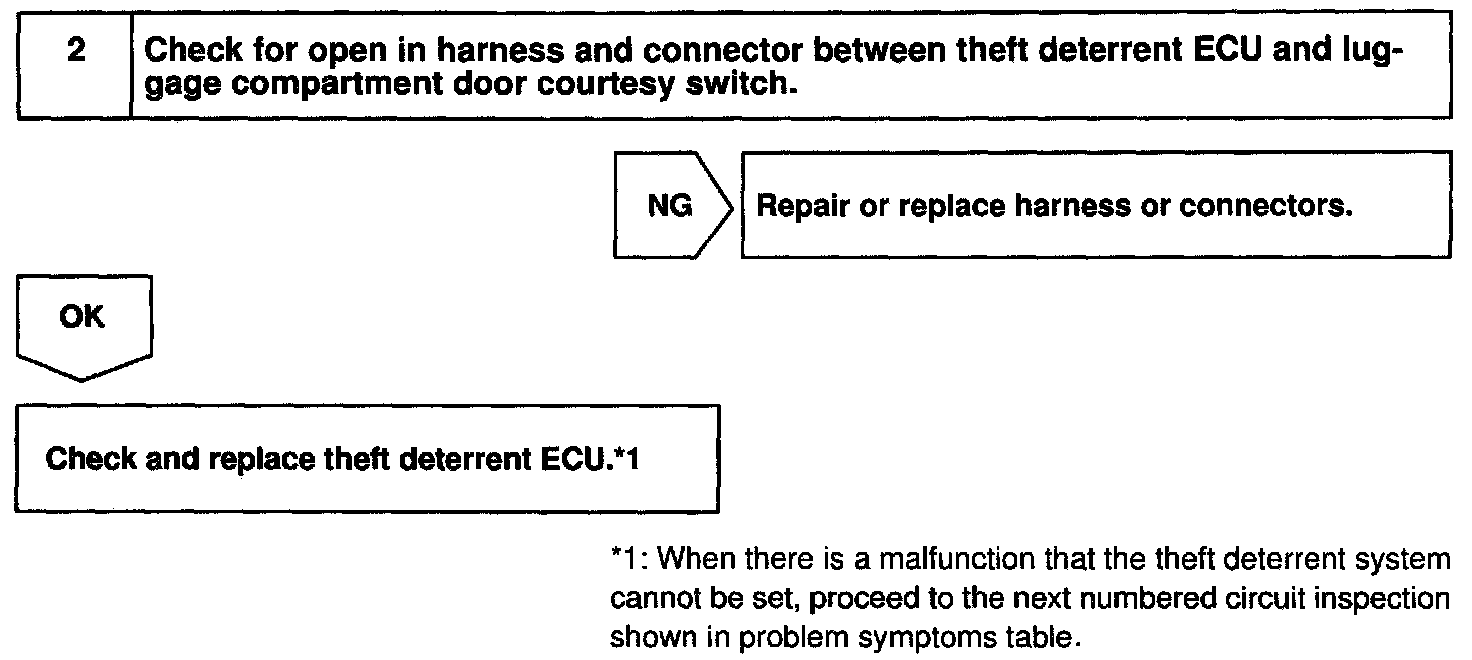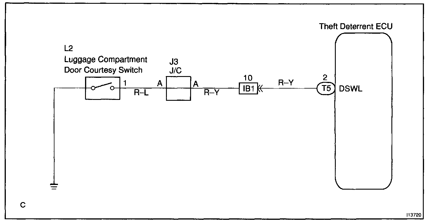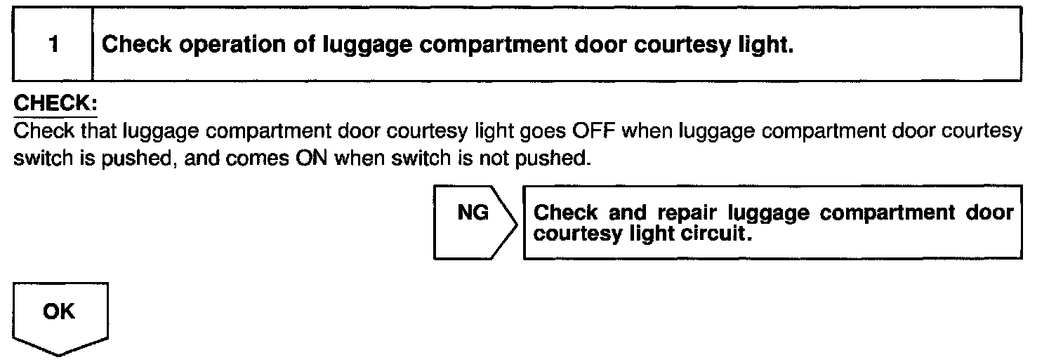 CIRCUIT DESCRIPTIONThe luggage compartment door courtesy switch goes ON when luggage compartment door is opened and goes OFF when the luggage compartment door is closed.