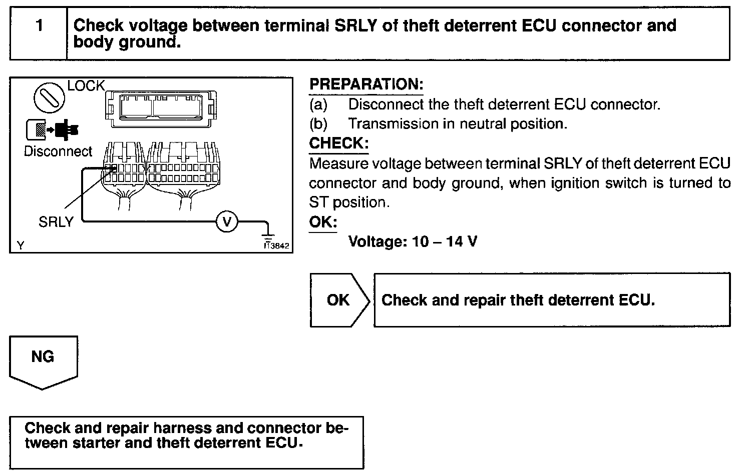 CIRCUIT DESCRIPTIONWhen the theft deterrent system is activated, contact (a) in the ECU becomes open, creating an open circuit in terminal SRLY circuit and making the starter inoperative (starter cut).