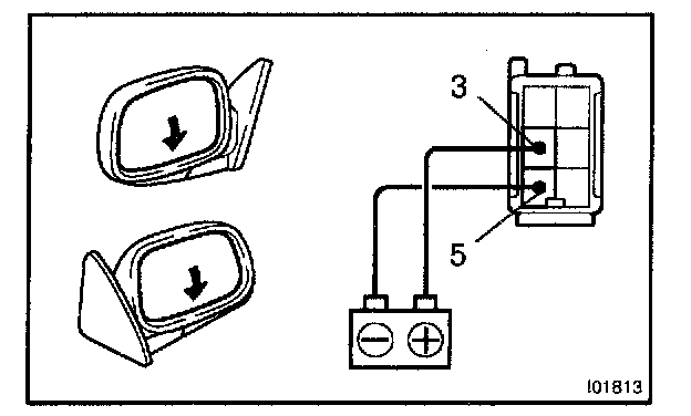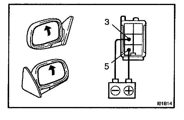 c. Connect the positive (+) lead from the battery to terminal 3 and the negative (-) lead to terminal 5, and check that the mirror turns to the downward.