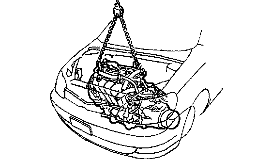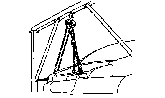 b) Slowly lower the vehicle, and raise the engine into the engine compartment.