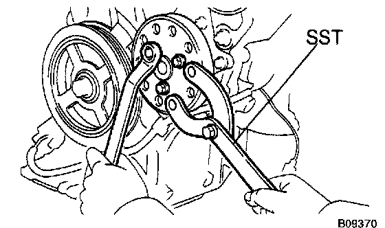 b) Turn the pulley, and check that the water pump bearing moves smoothly and quietly.