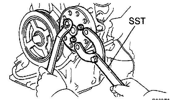 a) Using SST, remove the 3 bolts and pump pulley.