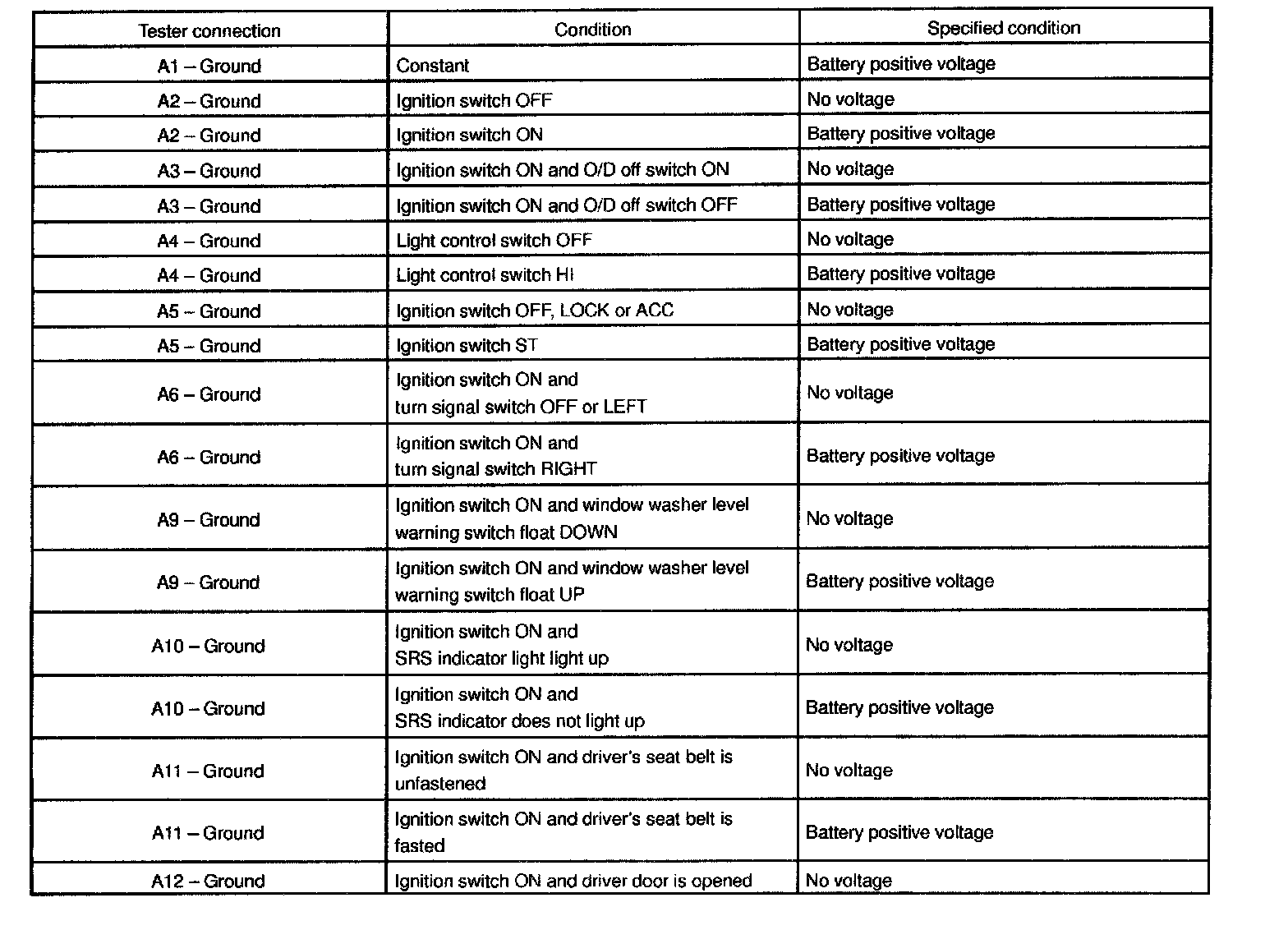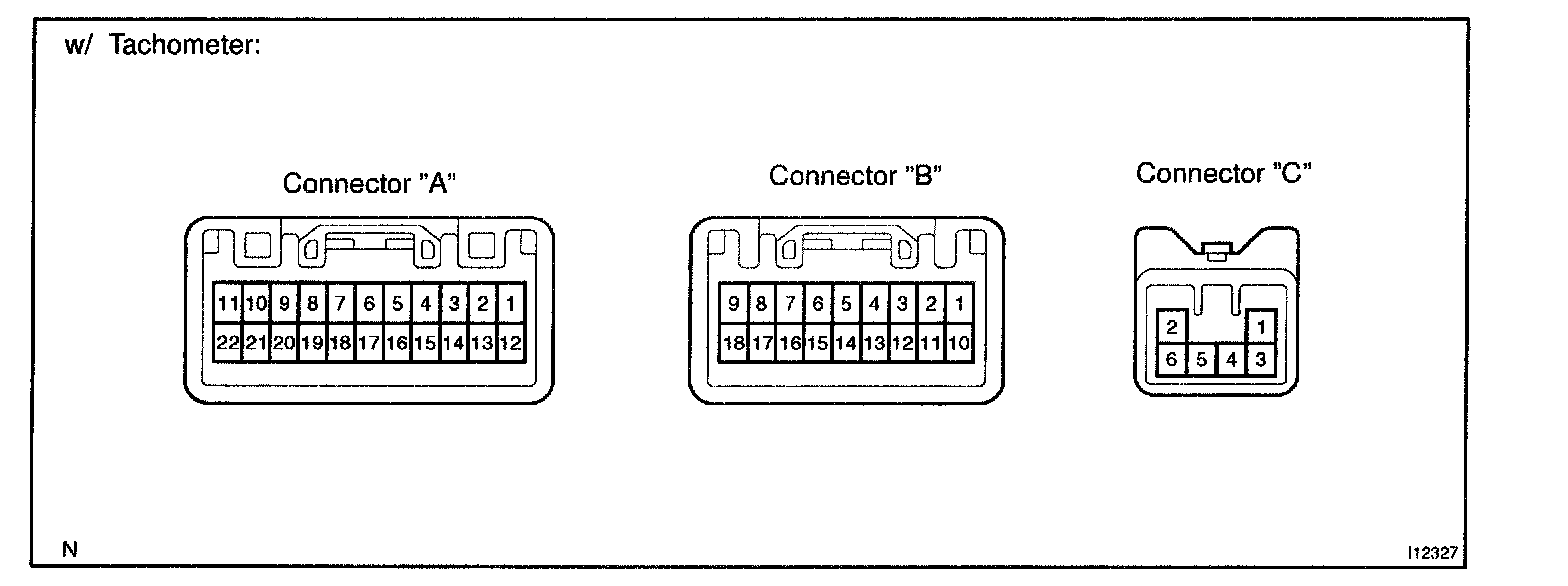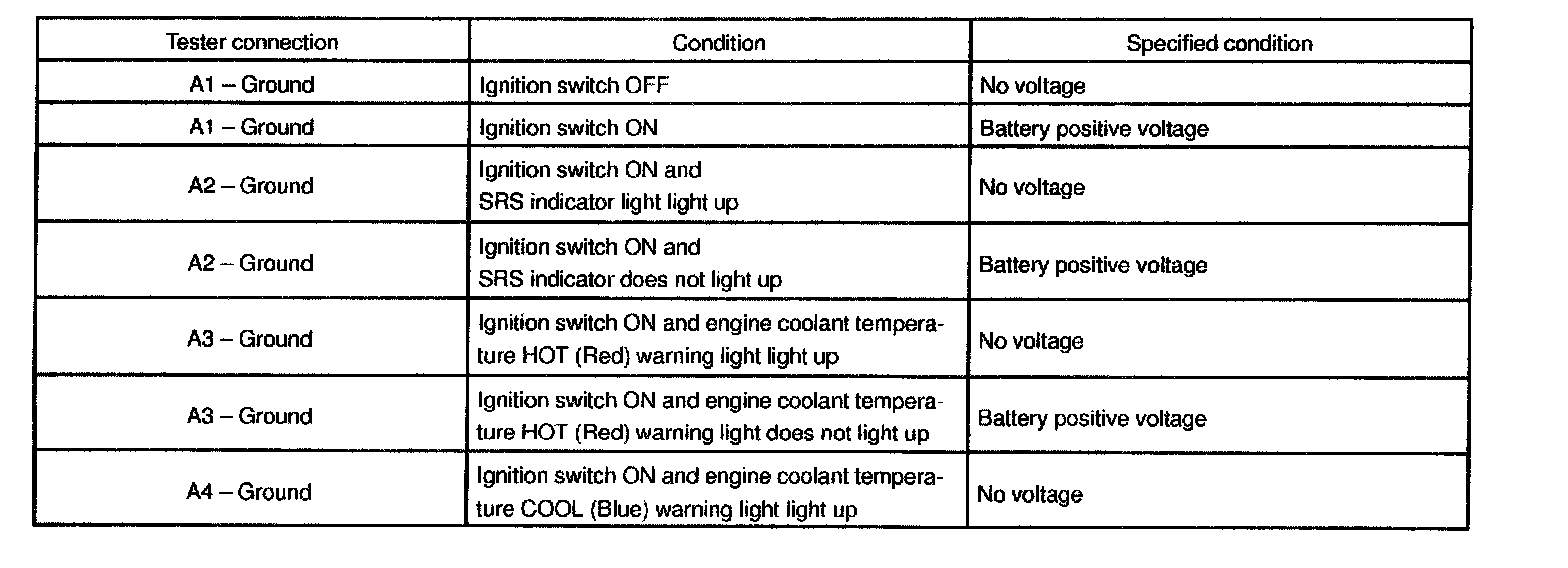 Connect the connector "A", "B" and "C" to the combination meter and inspect the wire harness side connectors from the back side as shown in the table.