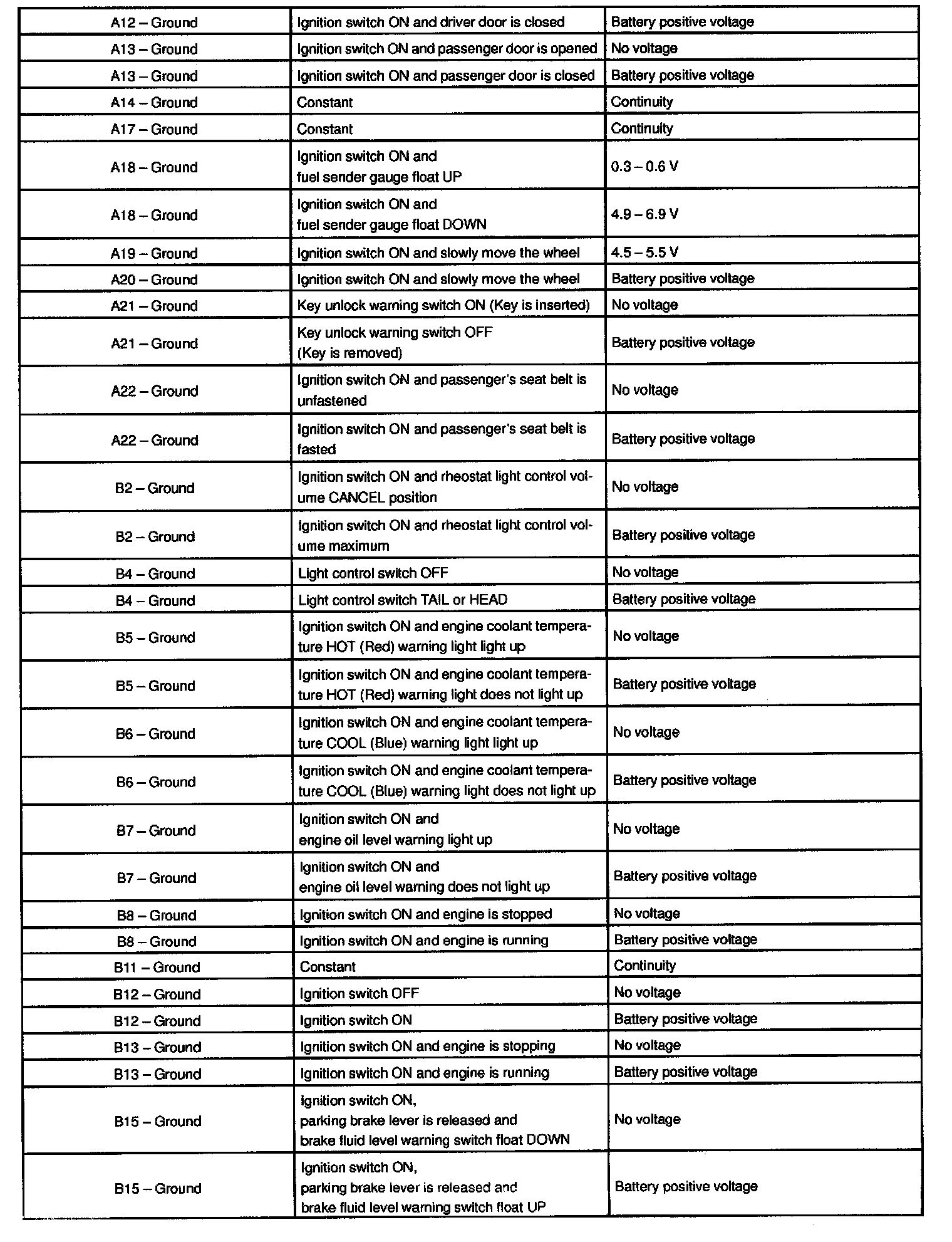 Connect the connector "A" and "B" to the combination meter and inspect the wire harness side connectors from the back side as shown in the table.