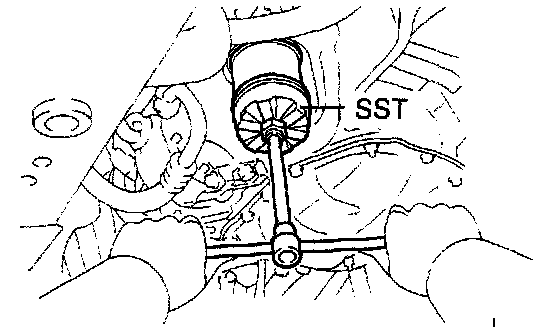 e) Lightly screw the oil filter into place, and tighten it until the gasket contacts the seat.