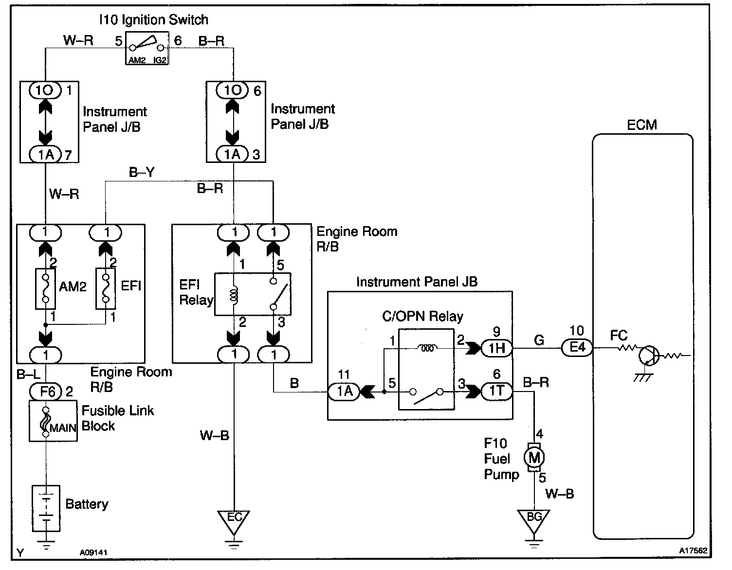 While the NE signal is generated (engine running), the ECM keeps the Tr ON (circuit opening relay ON) and the fuel pump also keeps operating.