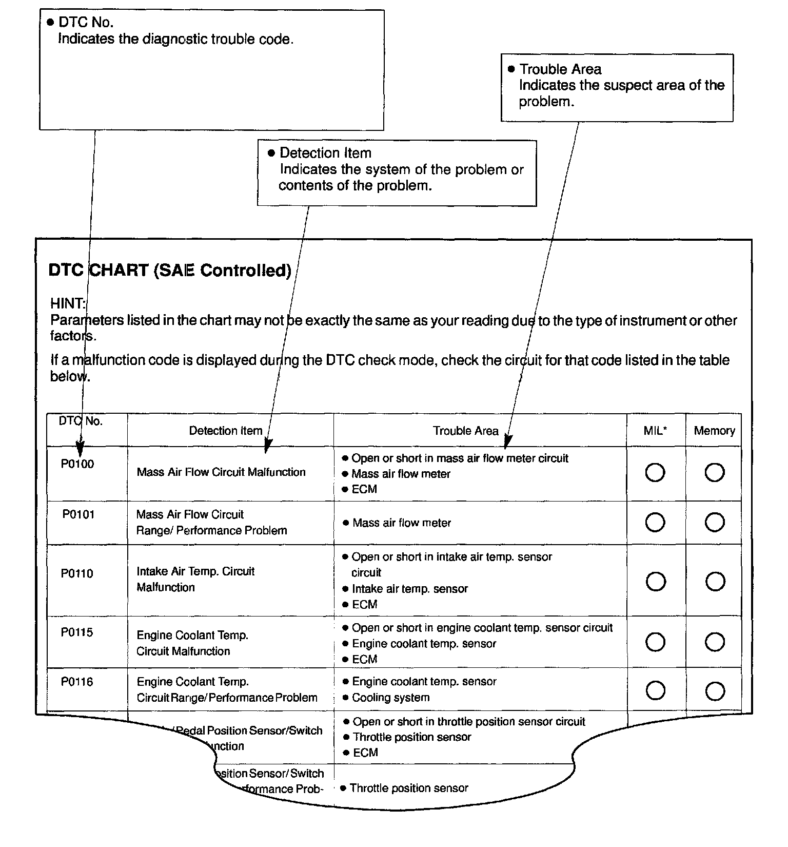 DIAGNOSTIC TROUBLE CODE CHARTThe inspection procedure is shown in the table. This table permits efficient and accurate troubleshooting using the diagnostic trouble codes displayed in the diagnostic trouble code check. Proceed with troubleshooting in accordance with the inspection procedure given in the diagnostic chart corresponding to the diagnostic trouble codes displayed. The engine diagnostic trouble code chart is shown as an example.