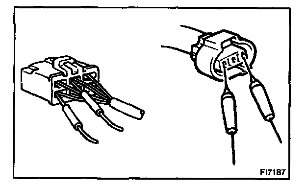When inserting tester probes into a connector, insert them from the rear of the connector. When necessary, use mini test leads. For water resistant connectors which cannot be accessed from behind, take good care not to deform the connector terminals.