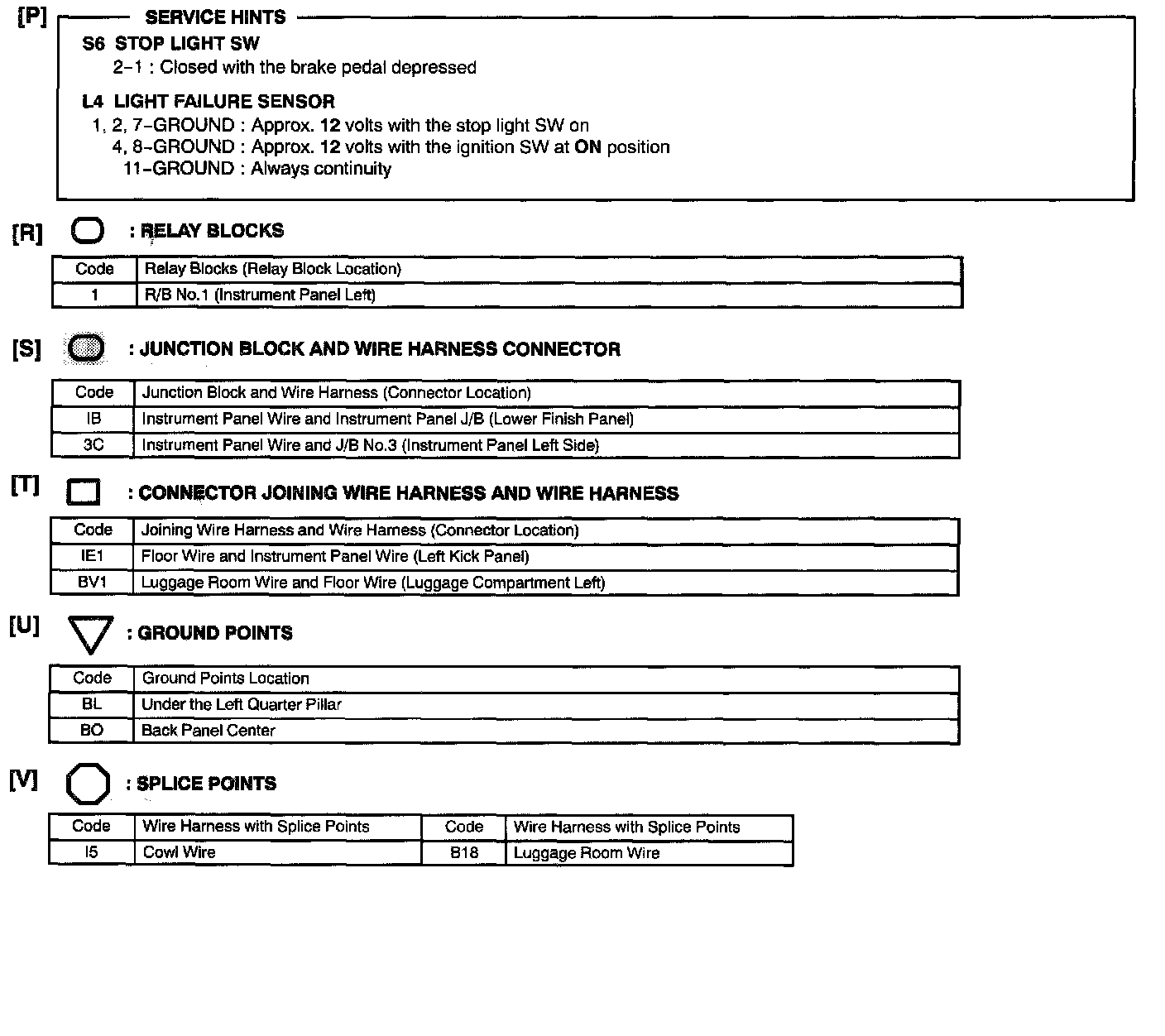 J: Indicates a wiring Splice Point (Codes are "E" for the Engine Room, "I" for the Instrument Panel, and "B" for the Body).