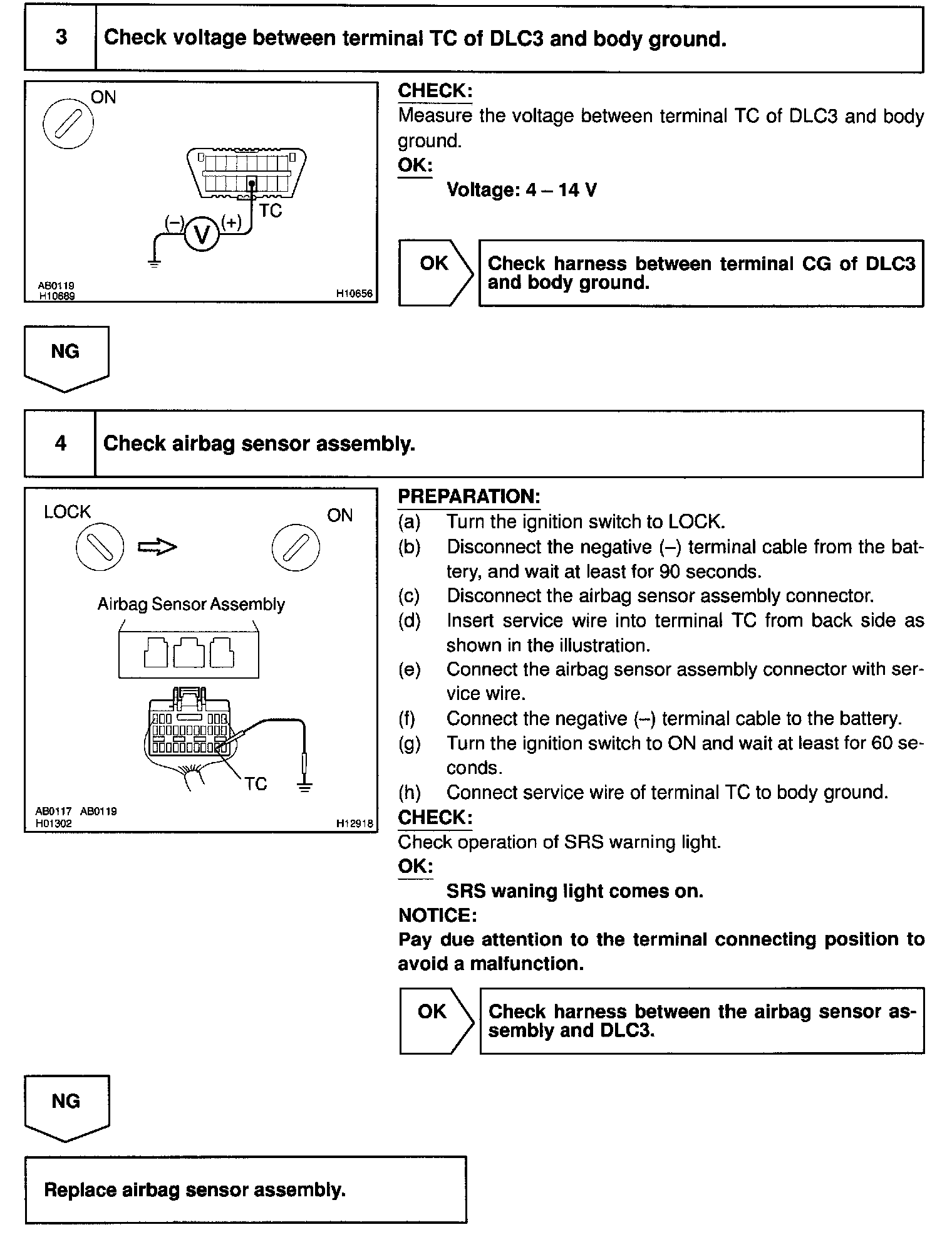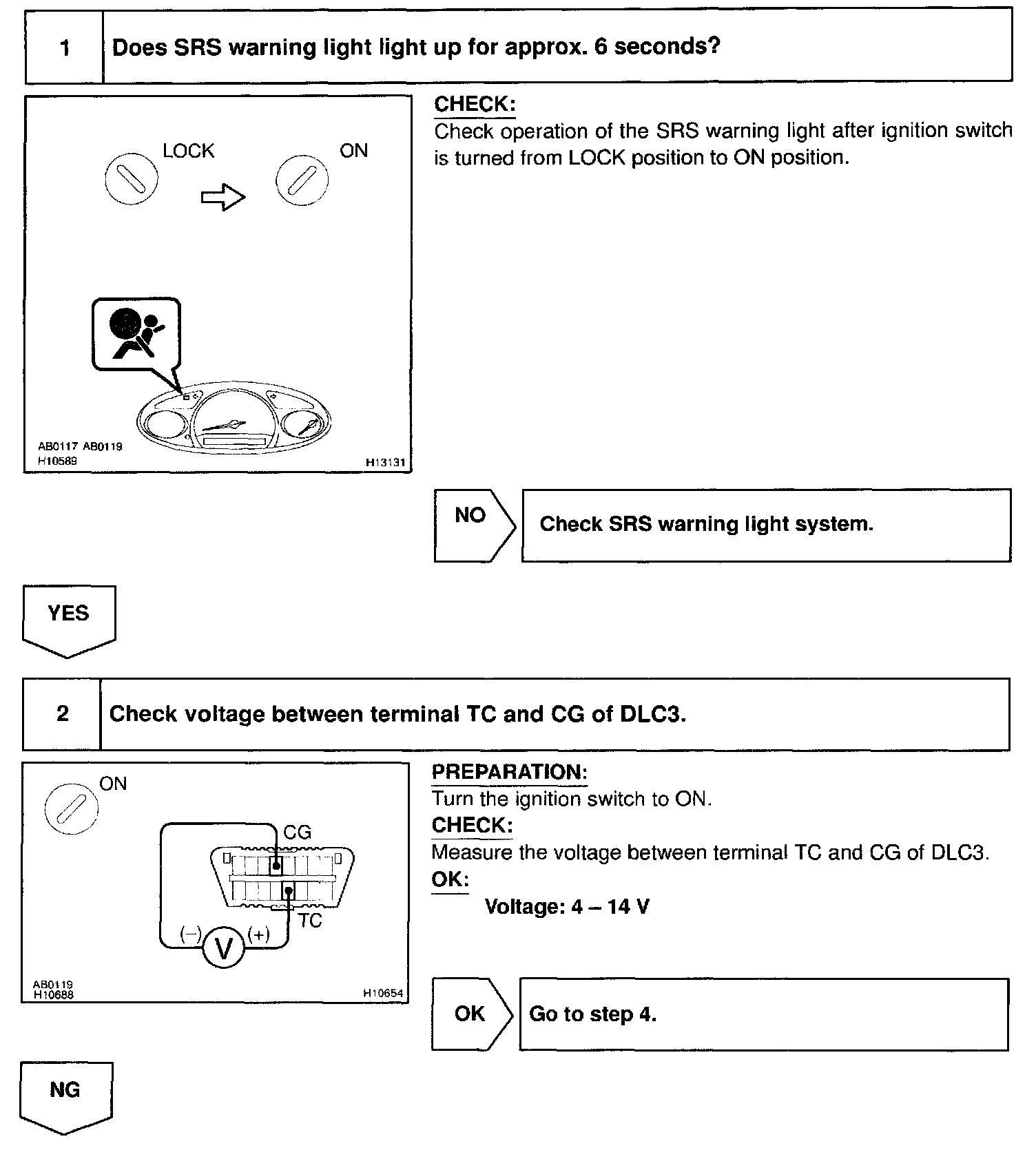 DTC output mode is set by connecting terminals TC and CG of the DLC3 the airbag sensor assembly. The DTCs are displayed by blinking the SRS warning light.