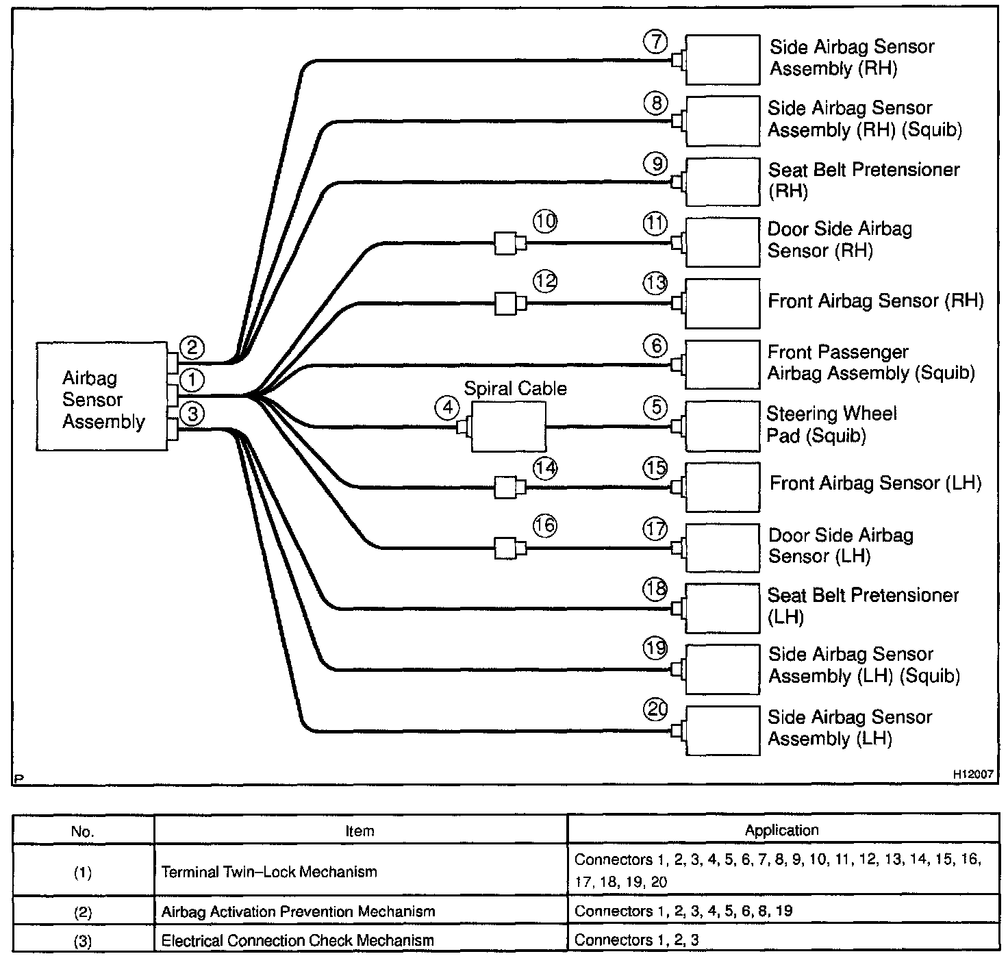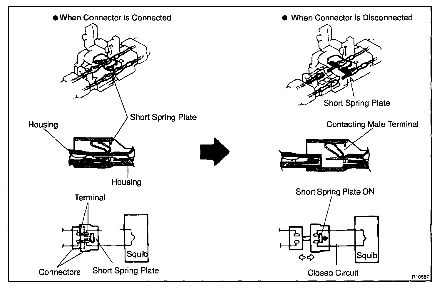 Each connector contains a short spring plate. When the connector is disconnected, the short spring plate automatically connects positive (+) terminal and negative (-) terminal of the squib.