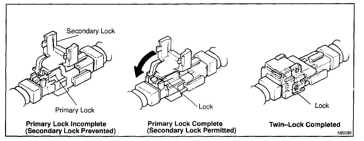 This mechanism electrically checks that connectors are connected correctly and completely. The electrical connection check mechanism is designed so that the disconnection detection pin connects with the diagnosis terminals when the connector housing lock is locked.