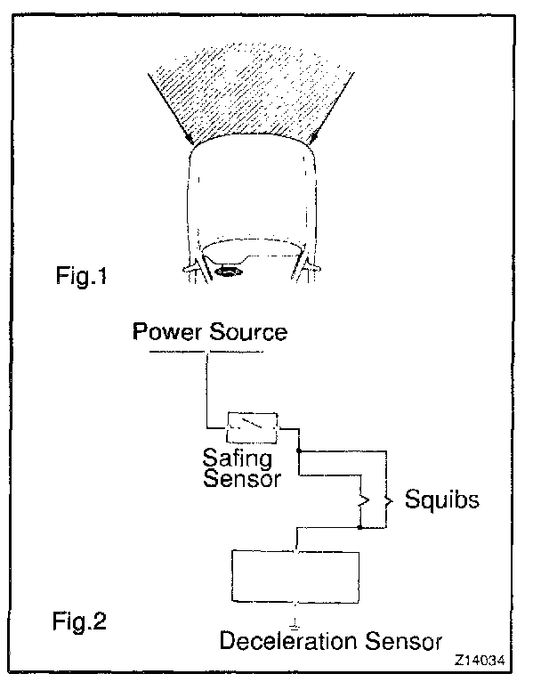 b. When the vehicle is involved in a frontal collision in the hatched area and the shock is larger than the ,pre-determined level, the SRS is activated automatically. A safing sensor is designed to go on at a smaller deceleration rate than the airbag sensor. As illustrated in Fig. 2, ignition is caused when current flows to the squib, which happens when a safing sensor and the deceleration sensor go on simultaneously. When a deceleration force acts on the sensors, 2 squibs in the driver airbag and front passenger airbag ignite and generate gas. The gas discharging into the driver airbag and front passenger airbag rapidly increases the pressure inside the bags, breaking open the steering wheel pad and instrument panel door. Bag inflation then ends, and the bags deflate as the gas is discharged through discharge holes at the bag's rear or side.