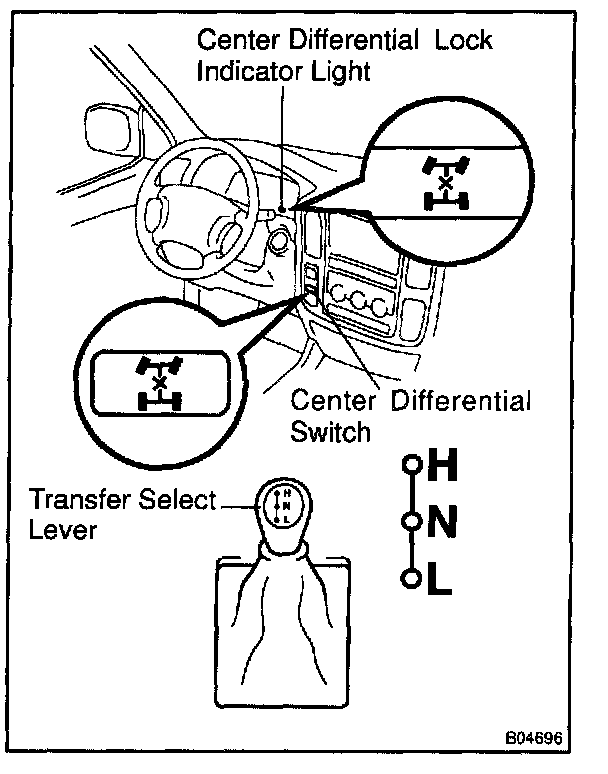 When the transfer select lever is put in "L" position, the center differential is put in LOCK condition regardless of the position of the center differential lock switch.