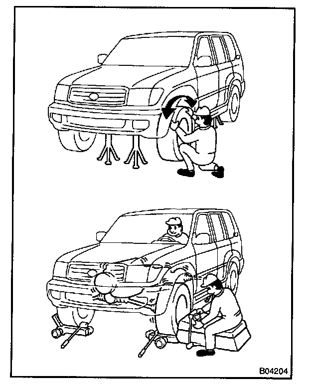 When doing on-vehicle wheel balancing on a full-time 4WD vehicle, to prevent each wheel from being rotated at different speed in different directions (which could damage the center differential), always be sure to observe the following precautions.