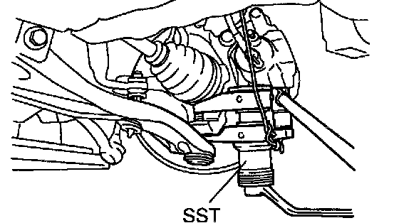 b. Using SST, disconnect the lower suspension arm from the steering knuckle.