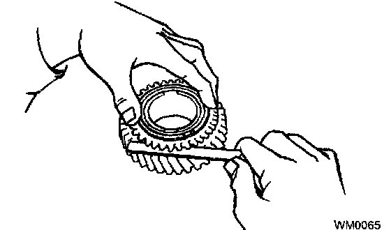 If the braking effect is insufficient, apply a small amount of the fine lapping compound between the synchronizer ring and gear cone. Lightly rub the synchronizer ring and gear cone together.