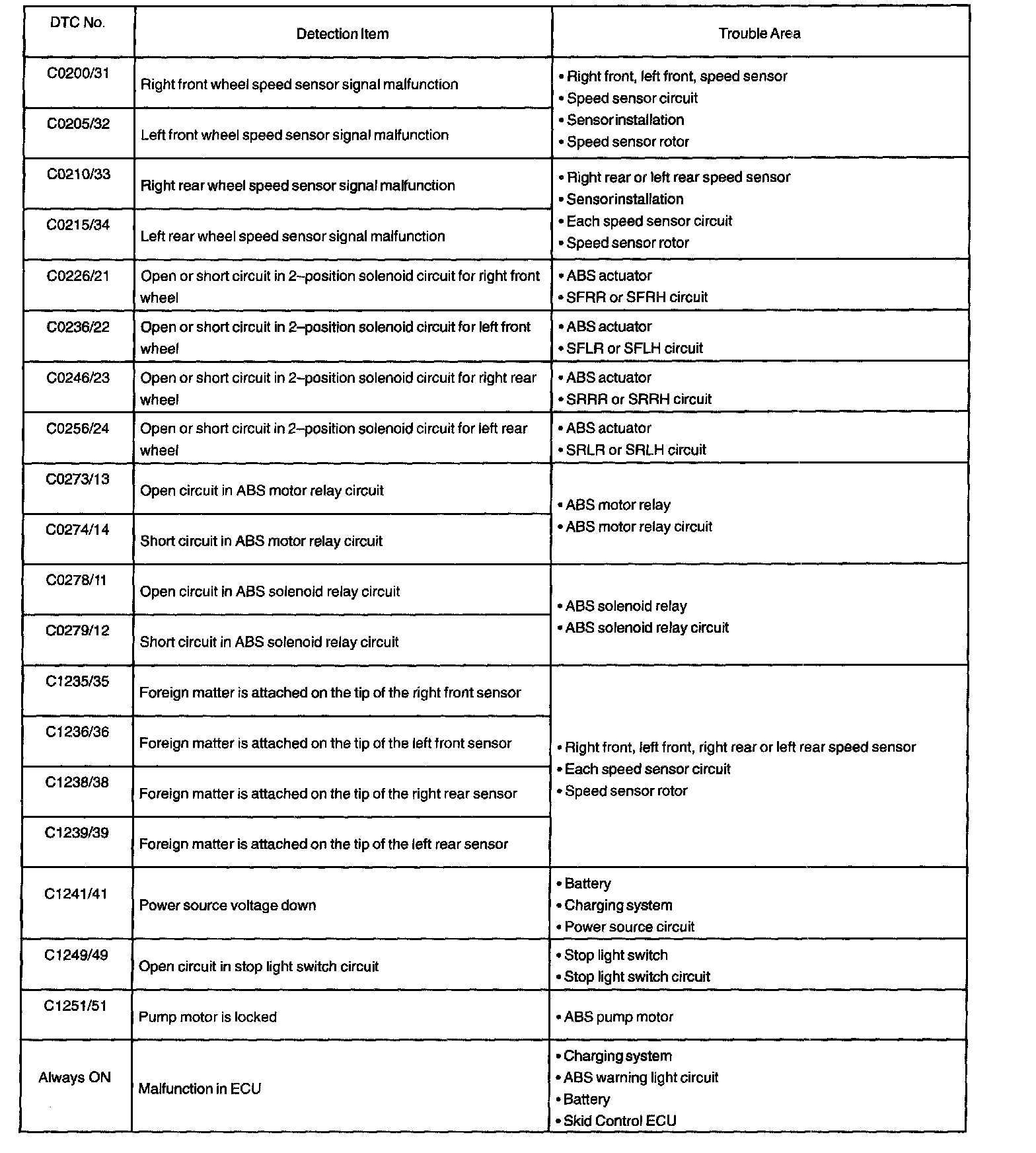 DIAGNOSTIC TROUBLE CODE CHARTC0200 - Always ON: