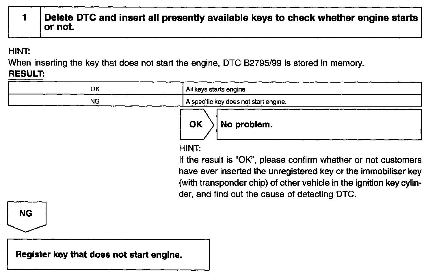 When the key outputs DTC B2795/99, register this key. When DTC B2795/99 is not output, there is a possibility that the unregistered key has been inserted before. (ECM is normal.)