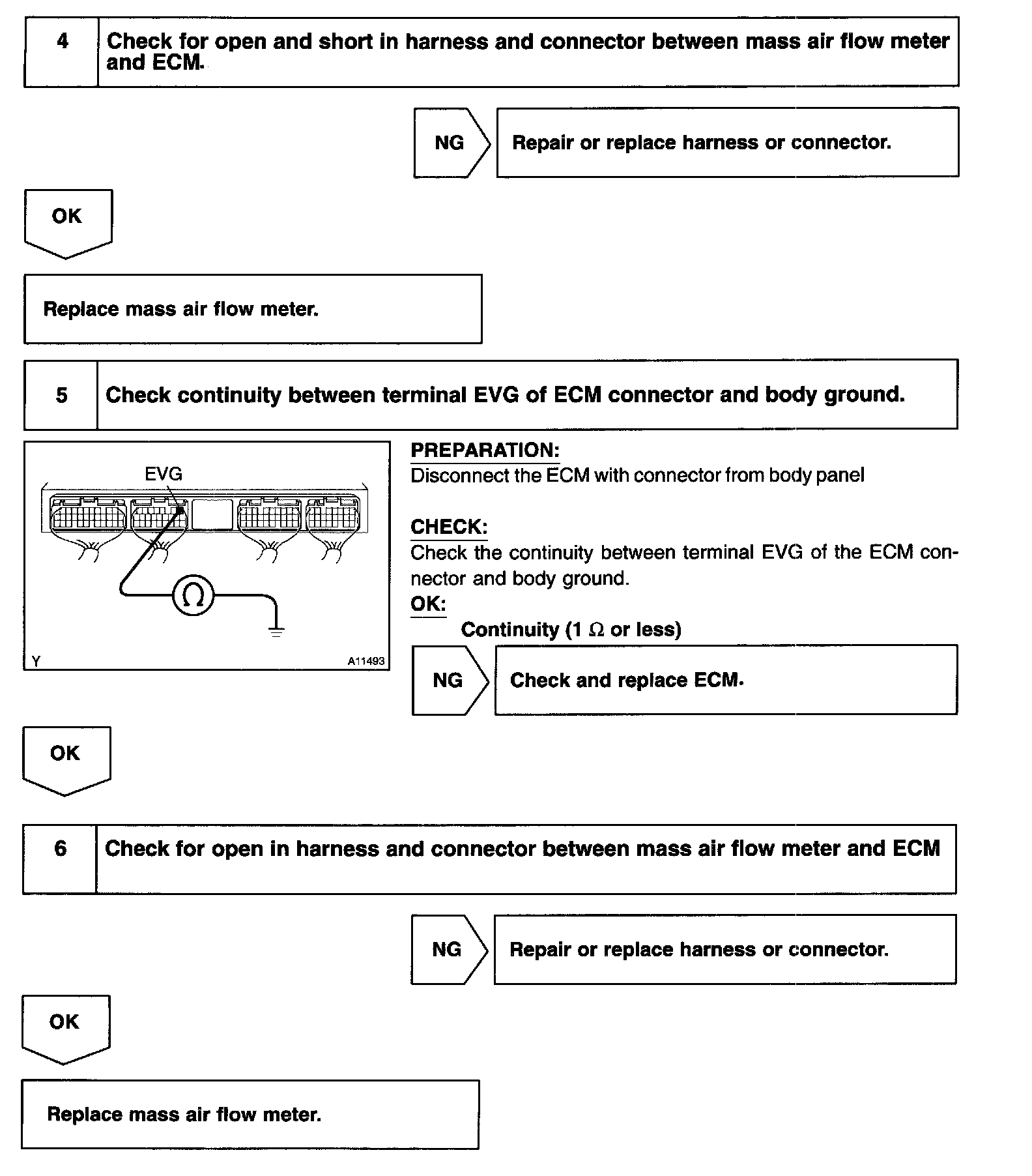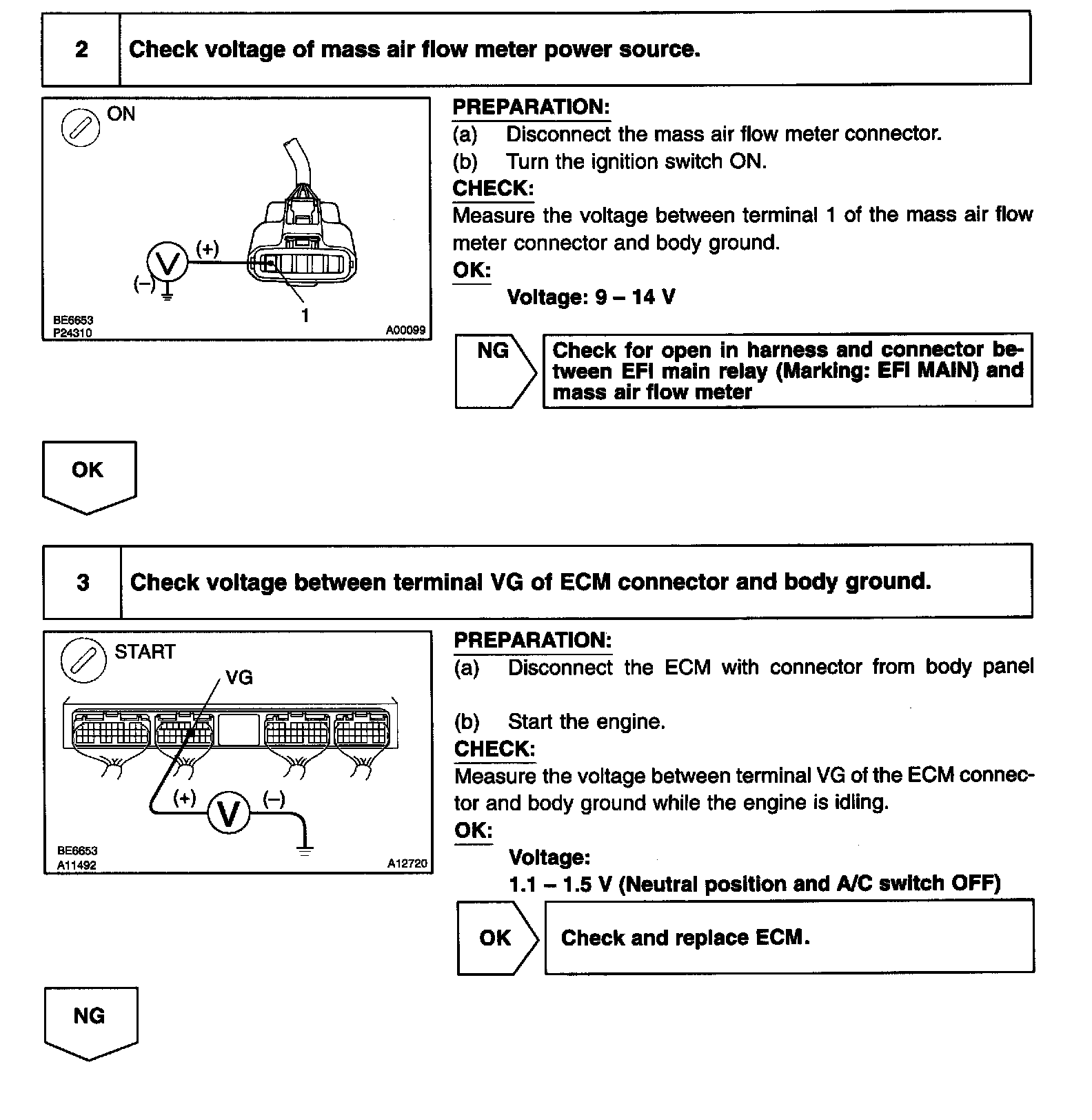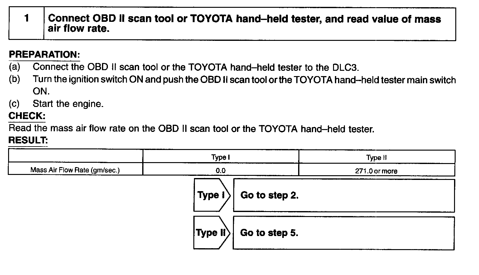 HINT: After confirming DTC P0100, use the OBD II scan tool or the TOYOTA hand-held tester to confirm the mass air flow ratio from the CURRENT DATA.