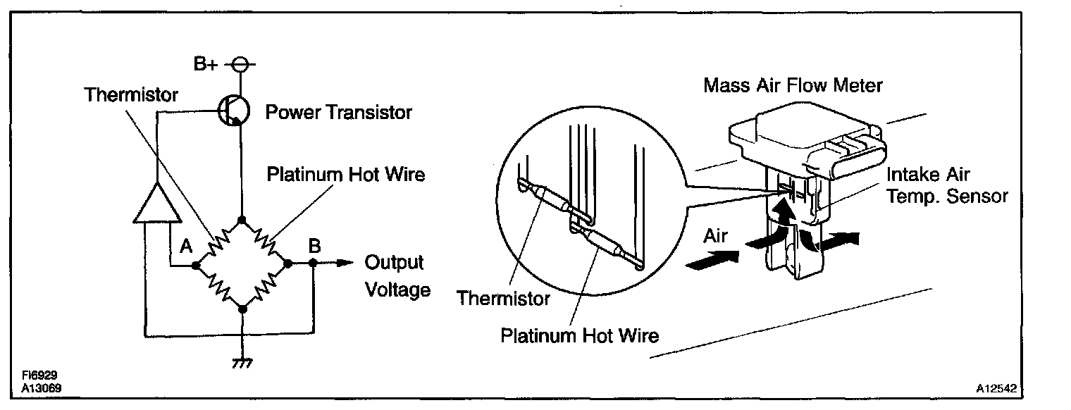 The mass air flow meter uses a platinum hot wire. The hot wire mass air flow meter consists of a platinum hot wire, thermistor and a control circuit installed in a plastic housing. The hot wire mass air flow meter works on the principle that the hot wire and thermistor located in the intake air bypass of the housing detect any changes in the intake air temperature.