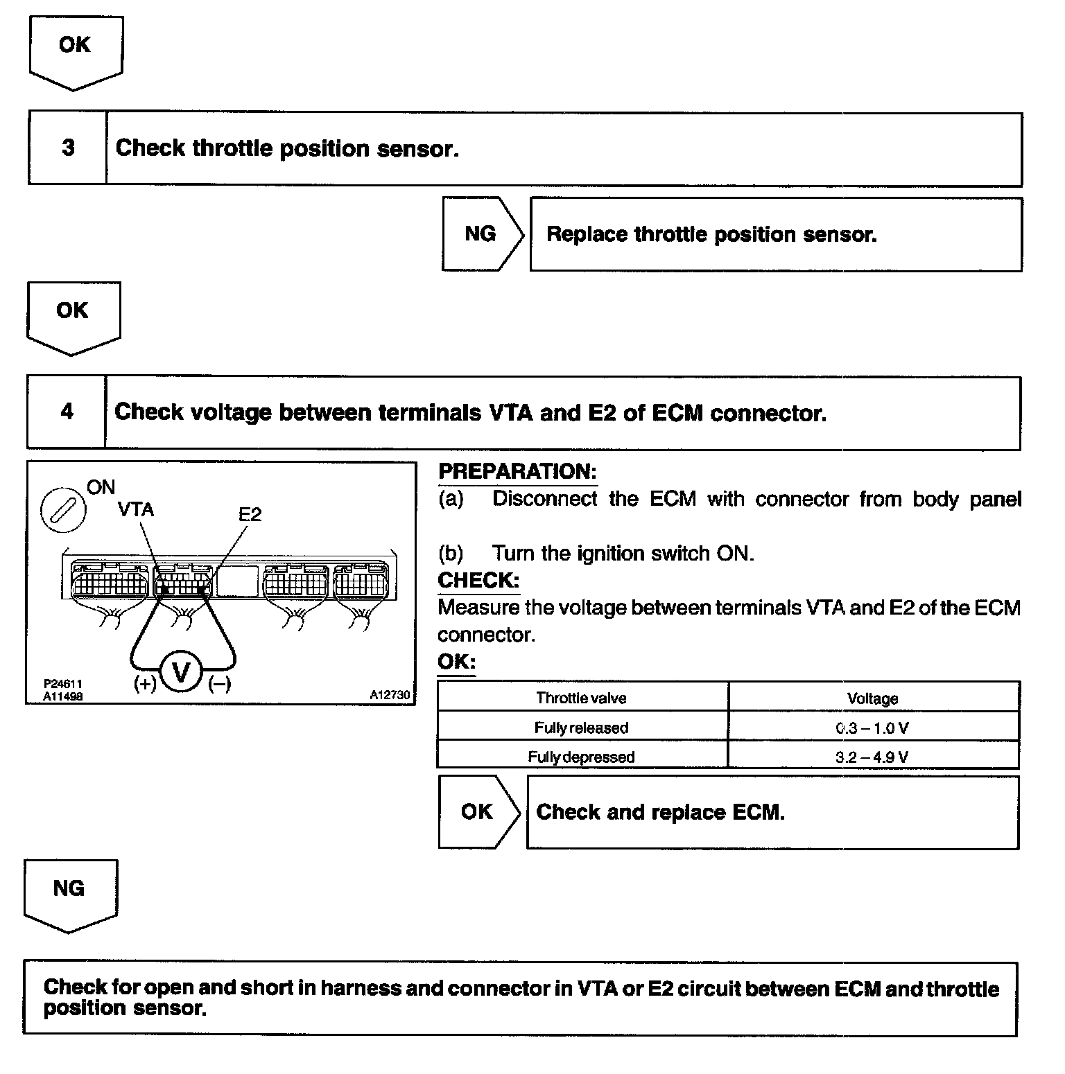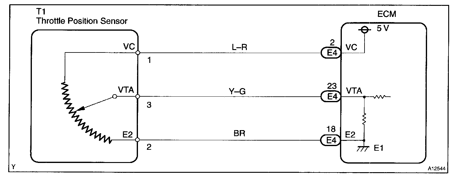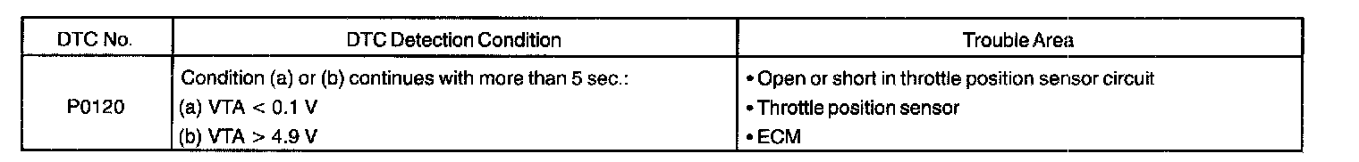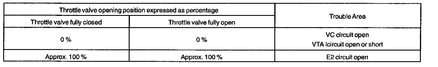 The throttle position sensor is mounted in the throttle body and detects the throttle valve opening angle. When the throttle valve is fully closed, a voltage of approximately 0.3 - 0.8 V is applied to terminal VTA of the ECM. The voltage applied to the terminals VTA of the ECM increases in proportion to the opening angle of the throttle valve and becomes approximately 3.2 - 4.9 V when the throttle valve is fully opened. The ECM judges the vehicle driving conditions from this signal input from terminal VTA, and uses it as one of the conditions to decide the air-fuel ratio correction, power increase correction and fuel-cut control etc.