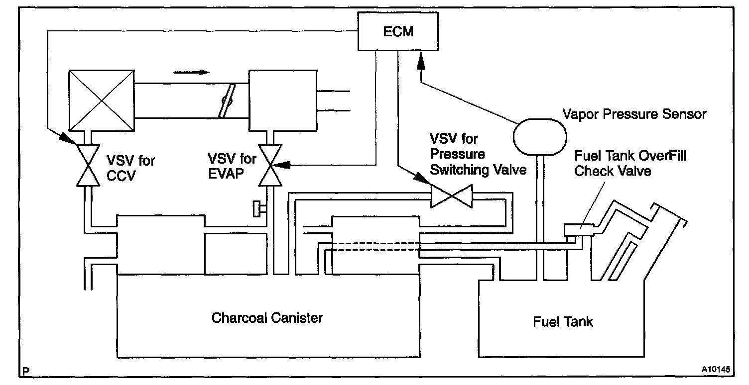 The vapor pressure sensor, the VSV for the canister closed valve (CCV) and the VSV for the pressure switching valve are used to detect abnormalities in the evaporative emission control system.