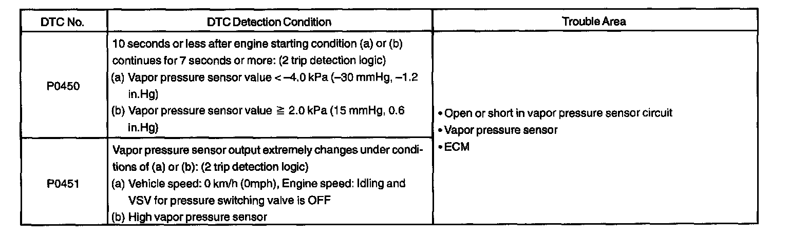 DTC P0450 or P0451 is recorded by the ECM when the vapor pressure sensor malfunctions.