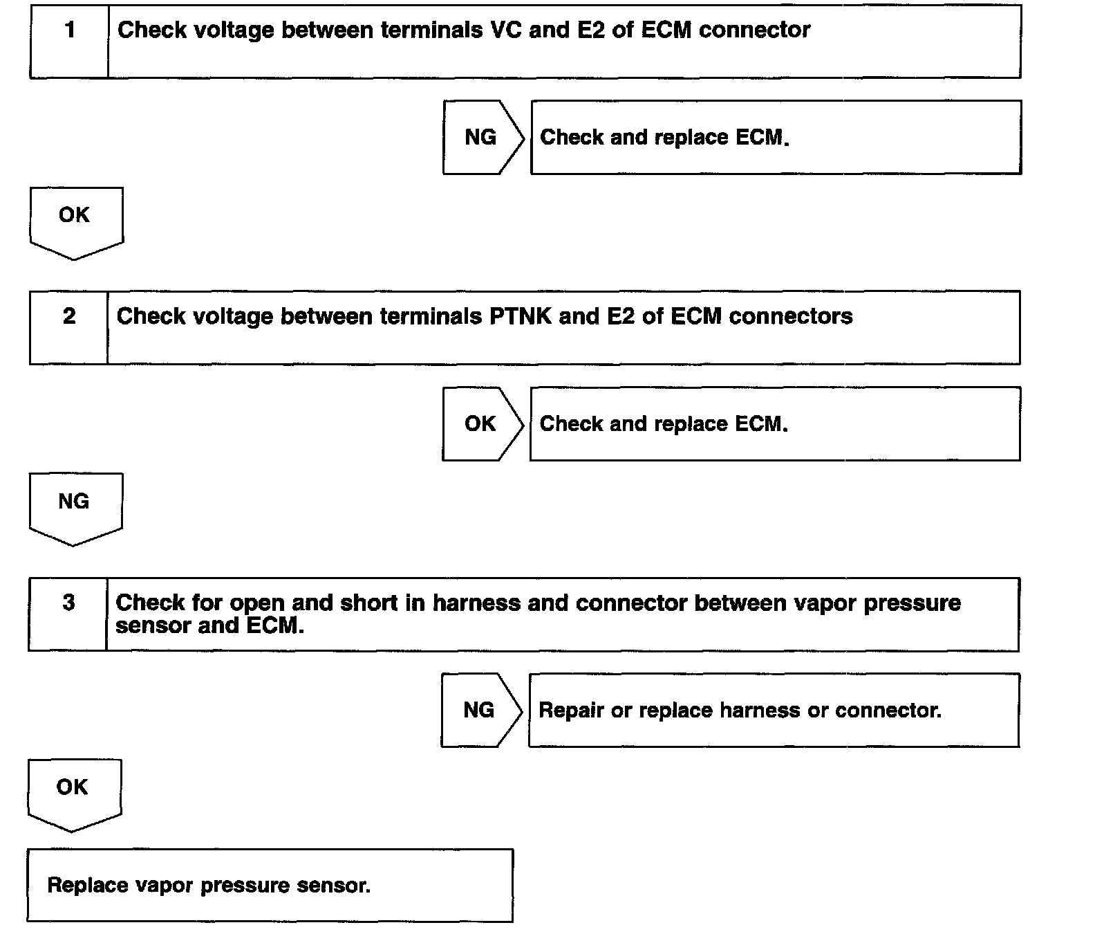 The ECM decides whether there is an abnormality in the evaporative emission control system, based on the vapor pressure sensor signal.