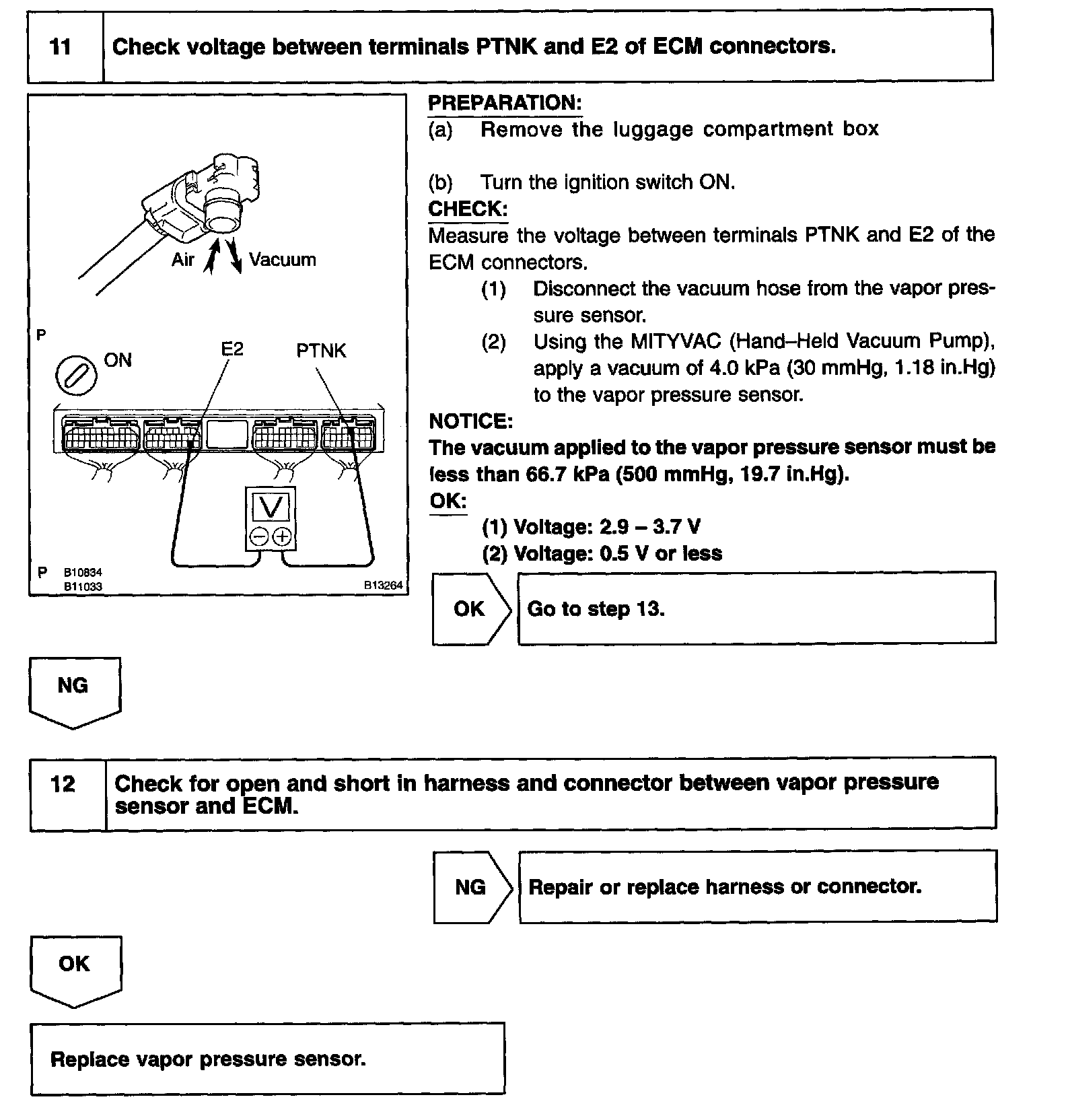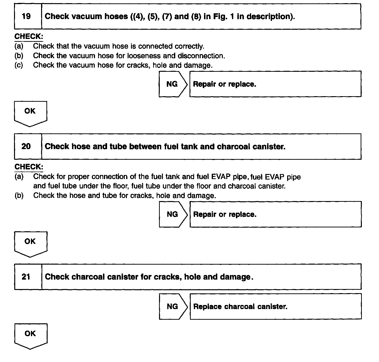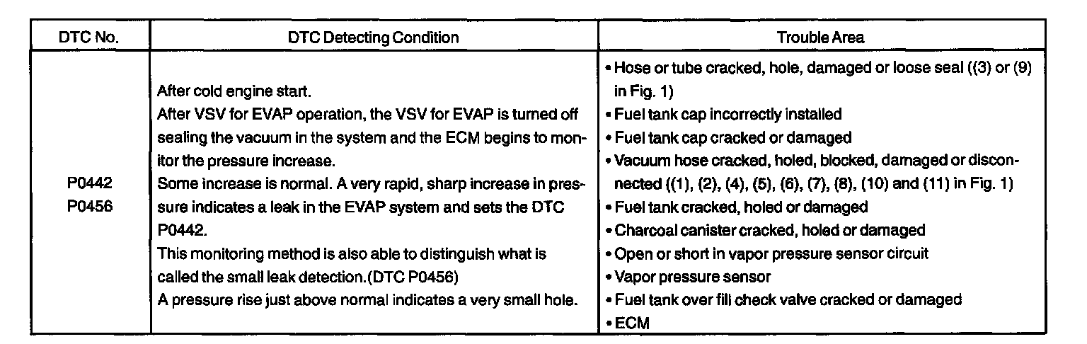 DTC P0442 or P0456 is recorded by the ECM when evaporative emissions leak from the components within the dotted line in Fig. 1. or when the vapor pressure sensor malfunctions.