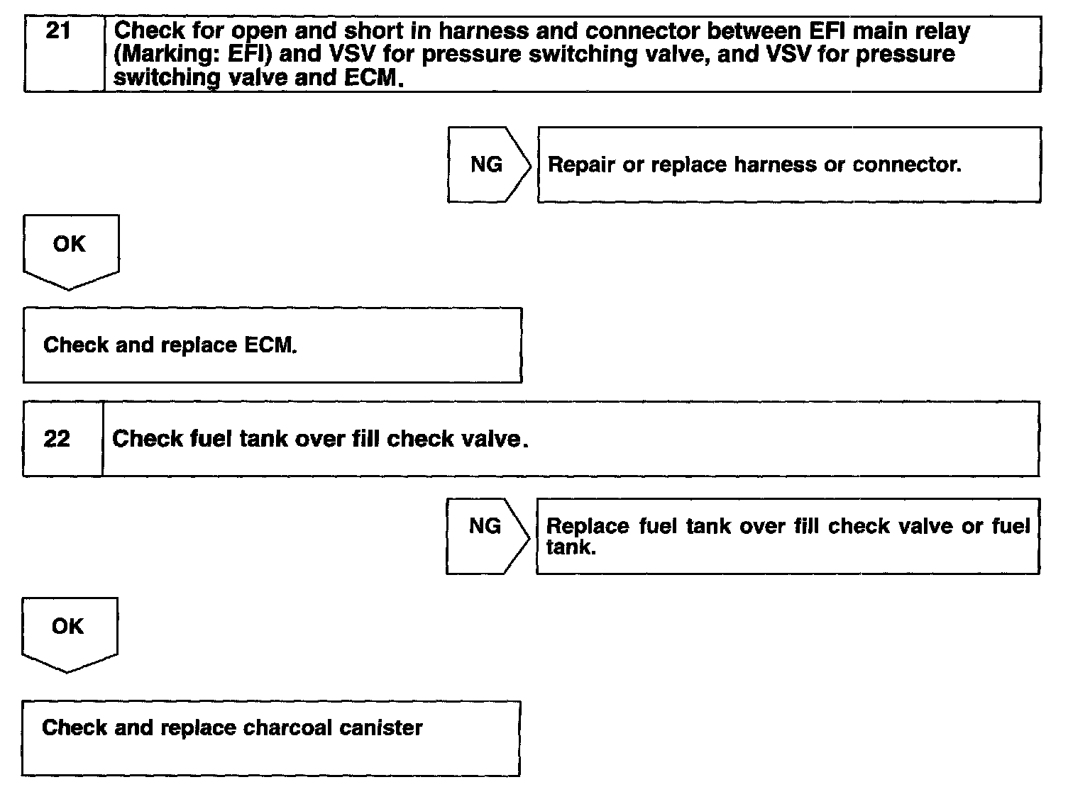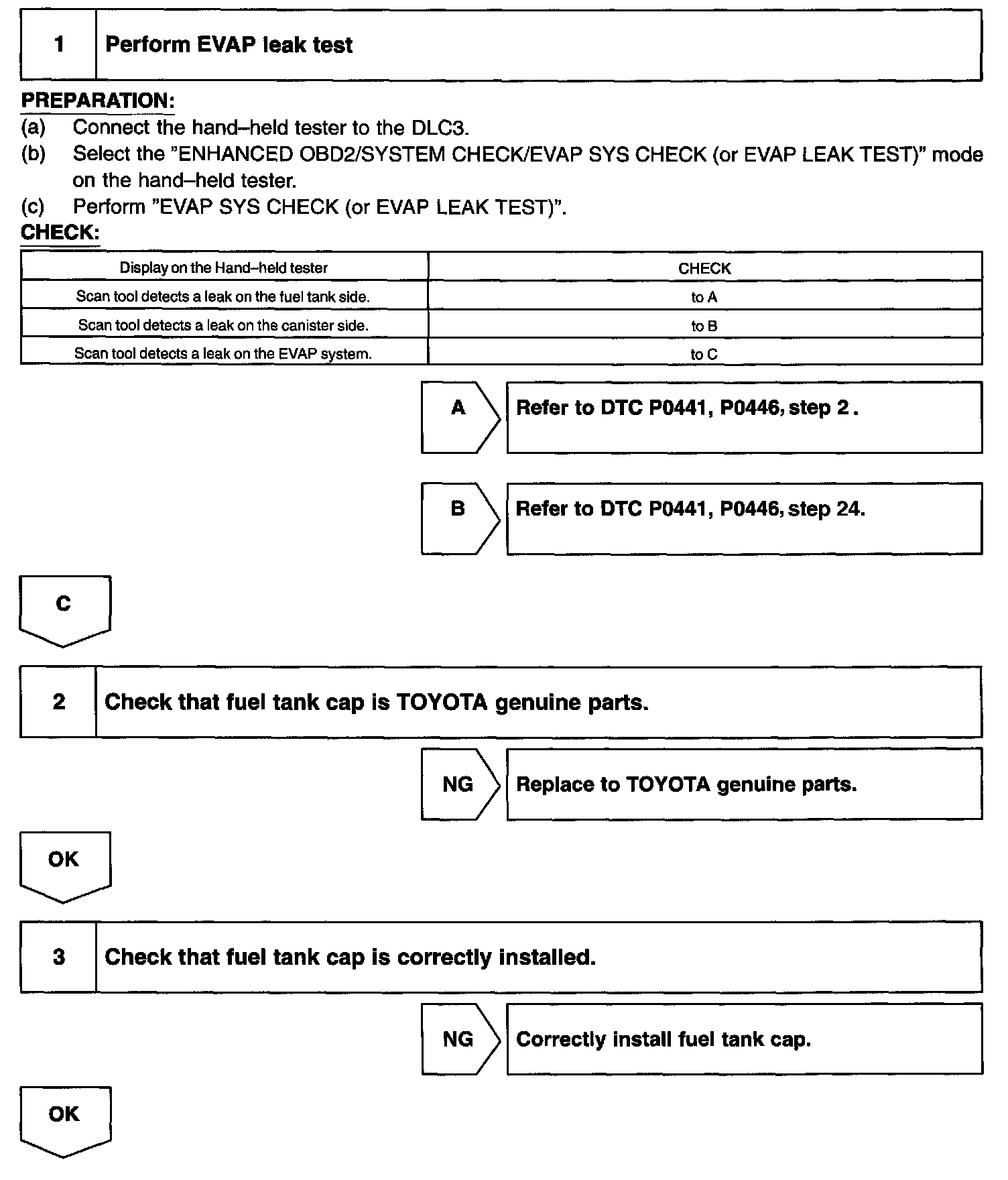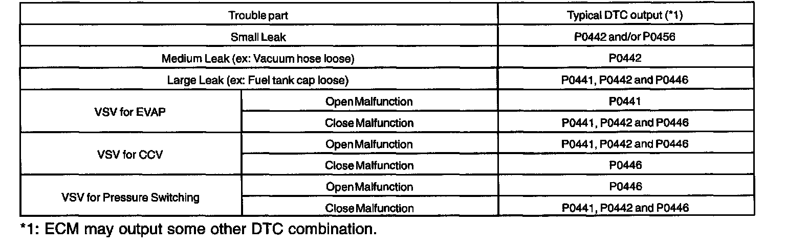 - If DTC P0441 (Purge Flow), P0446 (VSV for CCV or VSV for Pressure switching valve), P0451, P0452 (Evaporative Pressure Sensor) is output with DTC P0442 or P0456, first troubleshoot DTC P0441, P0446, P0451, P0452. If no malfunction is detected, troubleshoot DTC P0442 or P0456 next.