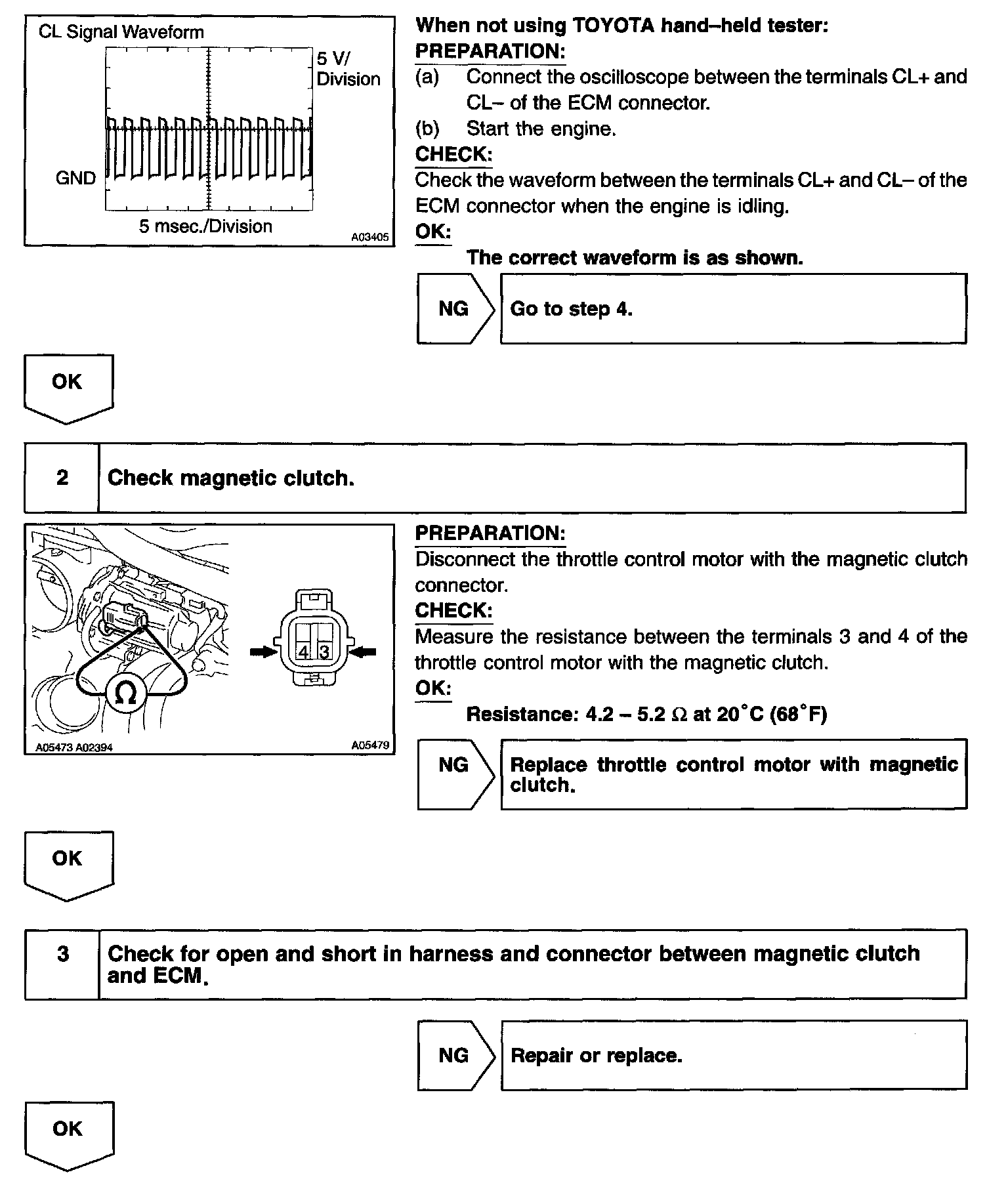 If this DTC is stored, the ECM shuts down the power for the throttle motor and the magnetic clutch, and the throttle valve is fully closed by the return spring.