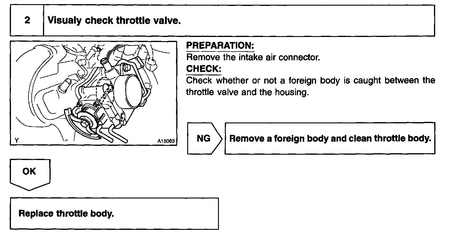 The throttle motor is operated by the ECM and it opens and closes the throttle valve. The opening angle of the throttle valve is detected by the throttle position sensor which is mounted on the throttle body. And, it provides feedback to the ECM to control the throttle motor in order to make the throttle valve opening angle properly in response to the driving condition. If this DTC is stored, the ECM shuts down the power for the throttle motor and the magnetic clutch, and the throttle valve is fully closed by the return spring. However, the opening angle of the throttle valve can be controlled by the accelerator pedal through the throttle cable.
