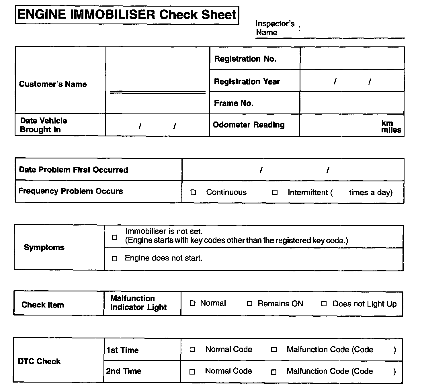 Engine Immobiliser Check Sheet: