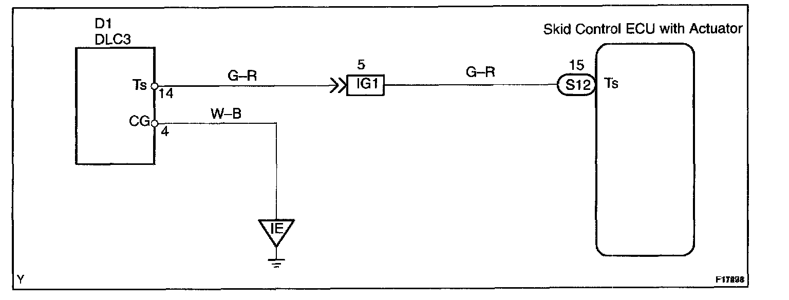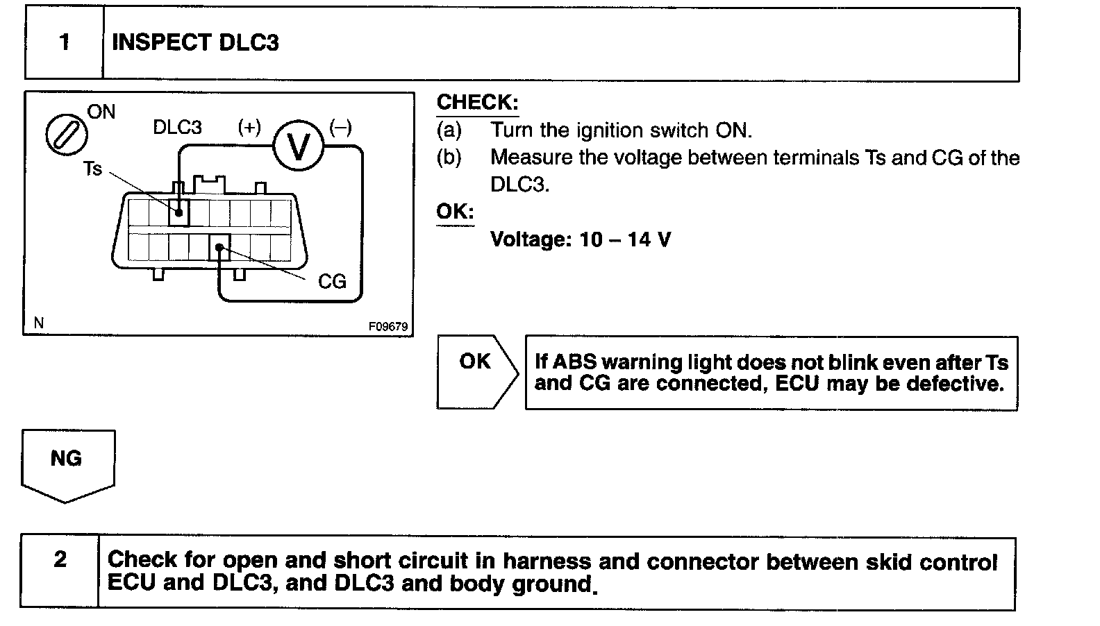 Connecting between terminals Ts and CG of the DLC3 causes the Skid Control ECU to output the DTC by flashing the ABS warning light.