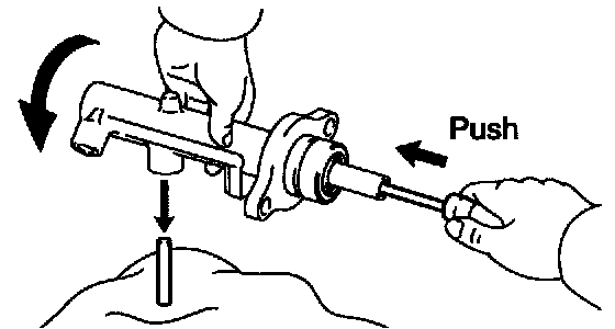 b. Push in the piston with a screwdriver, and remove the straight pins by turning over the cylinder body.