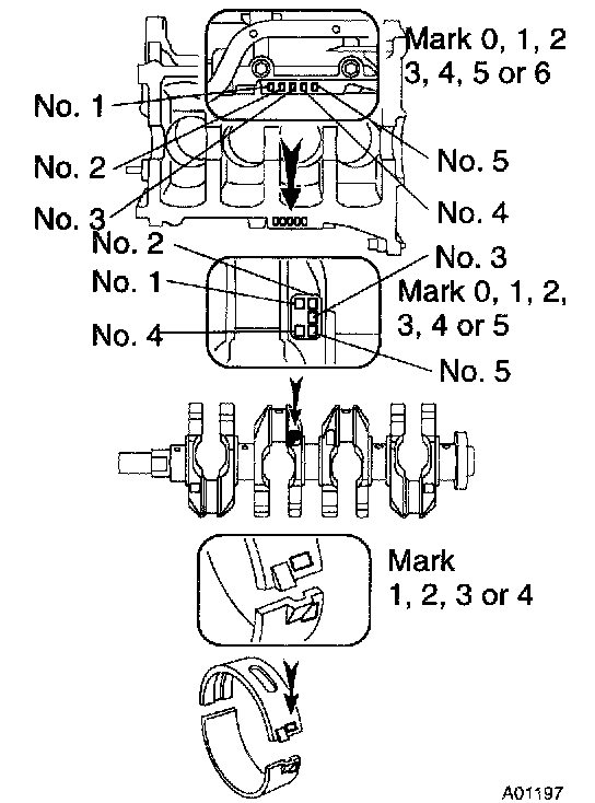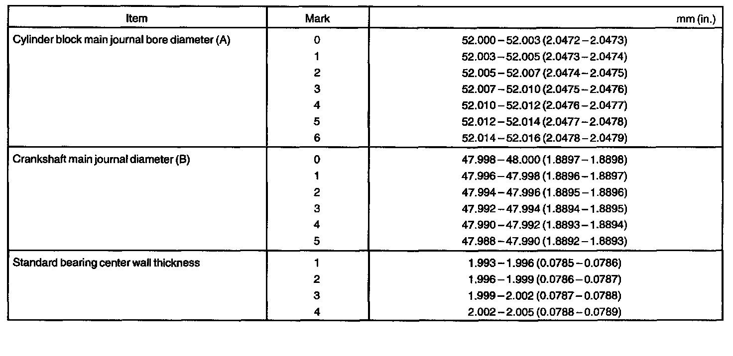 m. If using a standard bearing, replace it with one having the same number. If the number of the bearing cannot be determined, select the correct bearing by adding together the numbers imprinted on the cylinder block and crankshaft, then selecting the bearing with the same number as the total. There are 4 sizes of standard bearings, marked 1, 2, 3 and 4 accordingly.