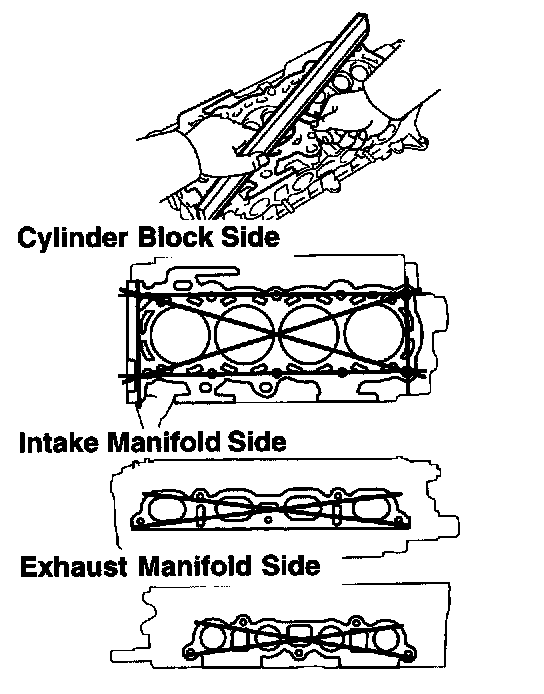 Using a precision straight edge and a feeler gauge, measure the surface contacting the cylinder block and the manifolds for warpage.